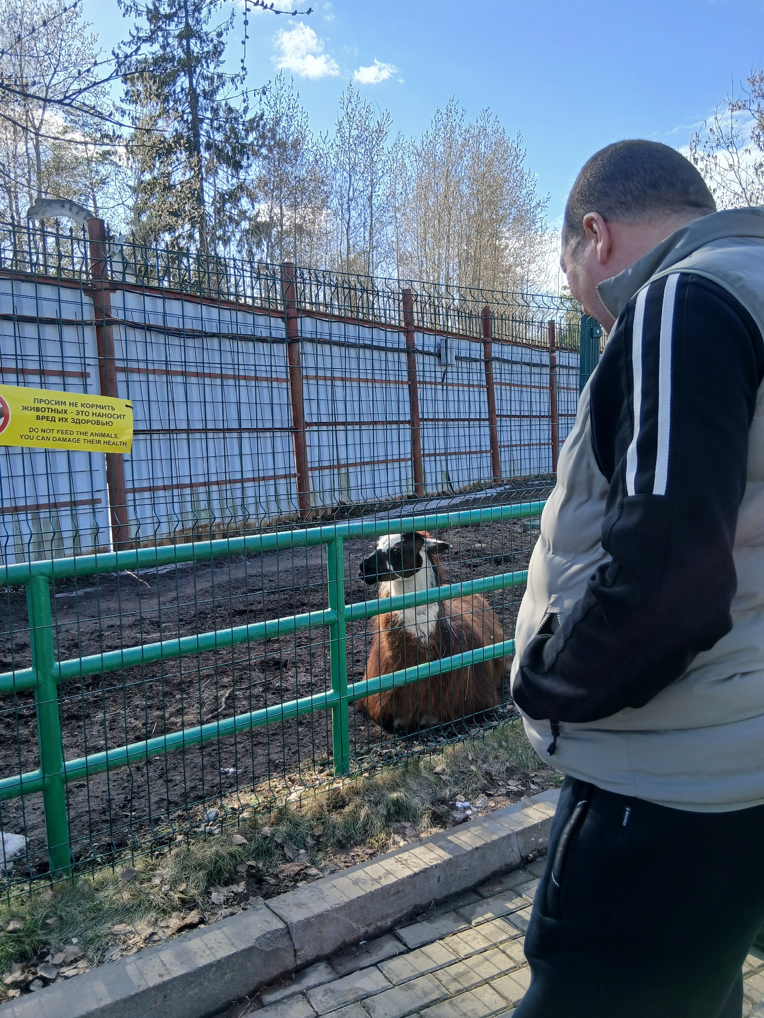 A man is looking at a goat in a fenced enclosure, likely at a zoo or animal park in Izhevsk, Russia. The man is wearing a light-colored jacket over a black jacket with white stripes on the sleeves, an…read more