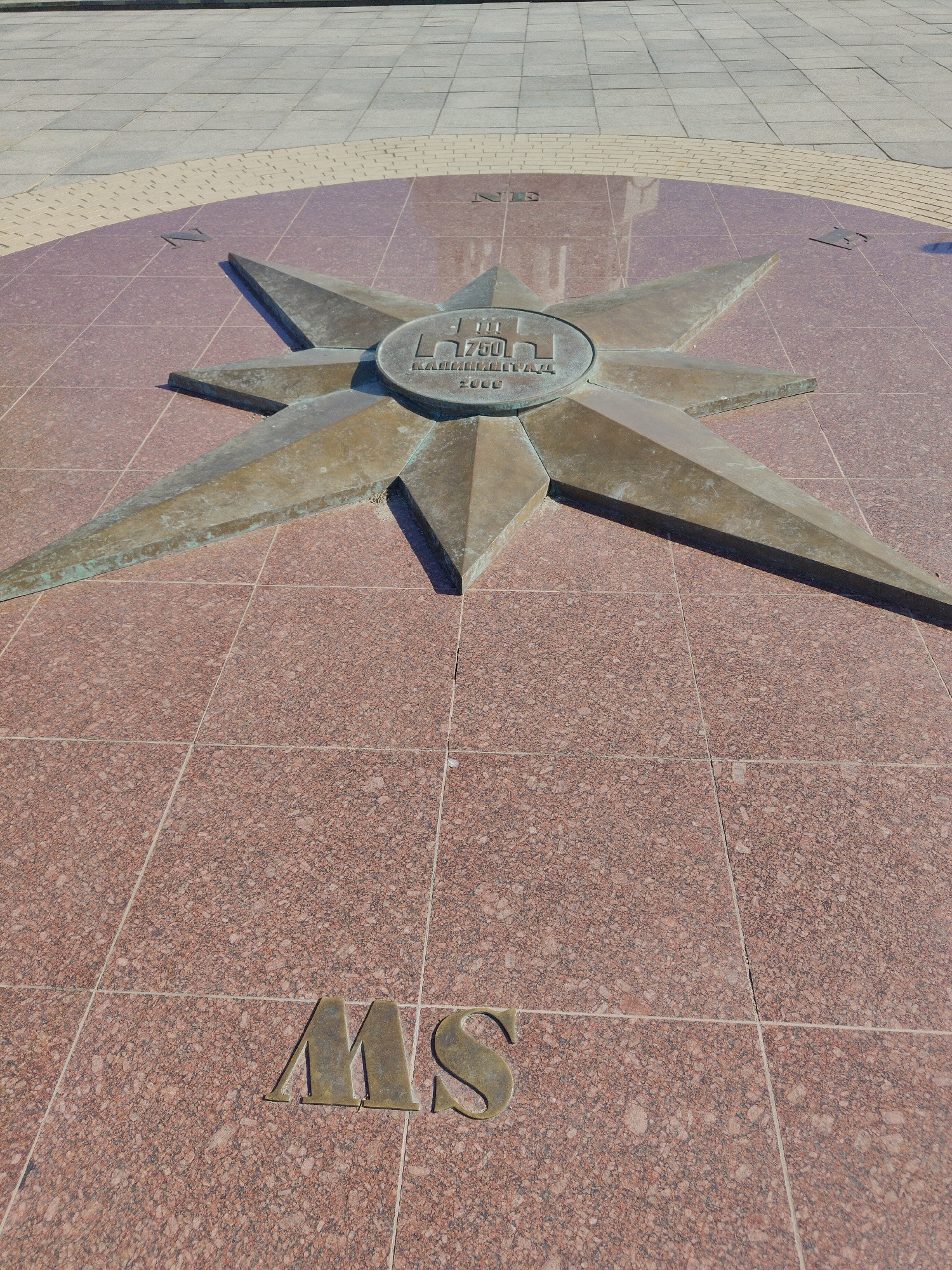 The image depicts a compass rose inlaid into a tiled surface. The compass rose is made of a tarnished metal, likely bronze or brass, and features a central emblem bearing the inscription "750 Kalining…read more