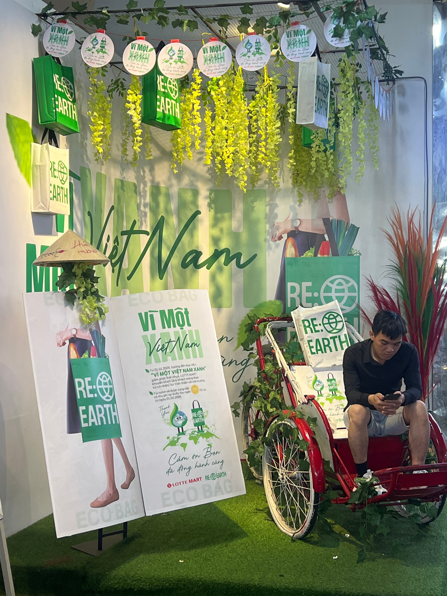 The image shows a promotional display in Đà Nẵng, Vietnam, likely inside a store or at an event. The display promotes an eco-friendly initiative called "RE: EARTH" with the slogan "For a Green Vietnam…read more