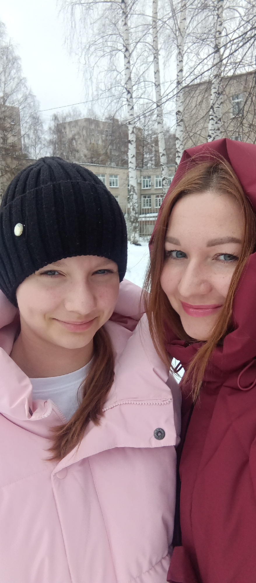 Two women pose closely for a selfie outdoors in an urban environment. The woman on the left wears a black beanie with a silver button and a light pink puffer jacket. She has fair skin and light-colore…read more