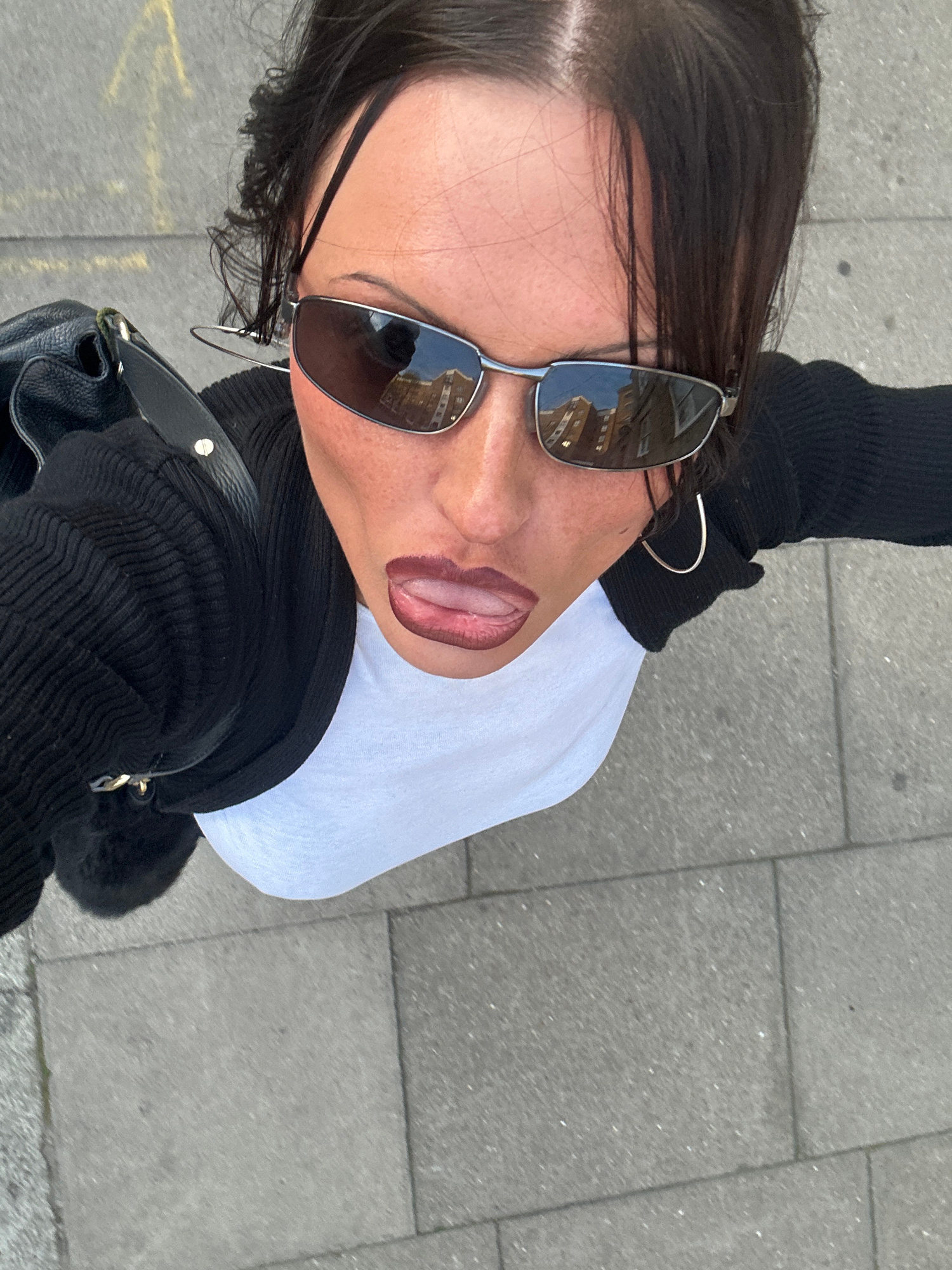 A high-angle, overhead selfie captures a close-up of a person, likely female, from the shoulders up, looking directly into the camera. The subject has dark hair, parted on the side, with some strands…read more
