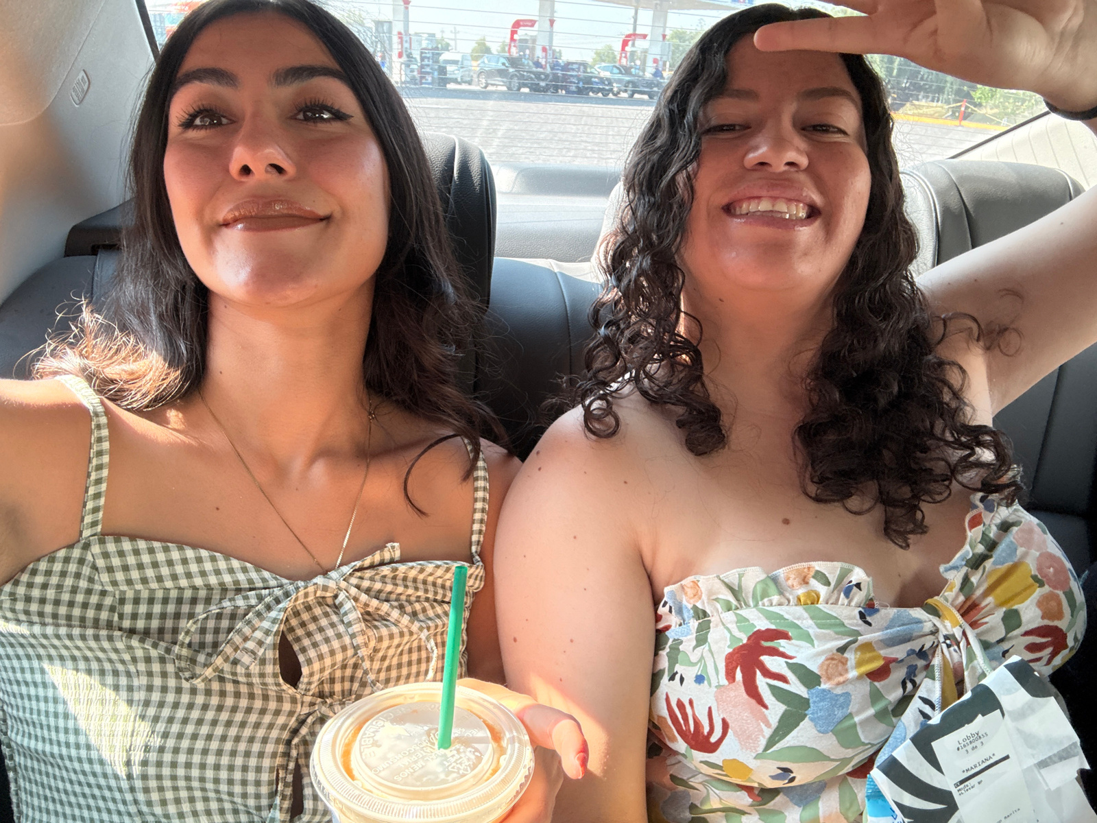 Two women are inside a car and appear to be taking a selfie while upside down. The woman on the left has curly brown hair and is wearing a floral patterned top. She is holding up a peace sign. The wom…read more