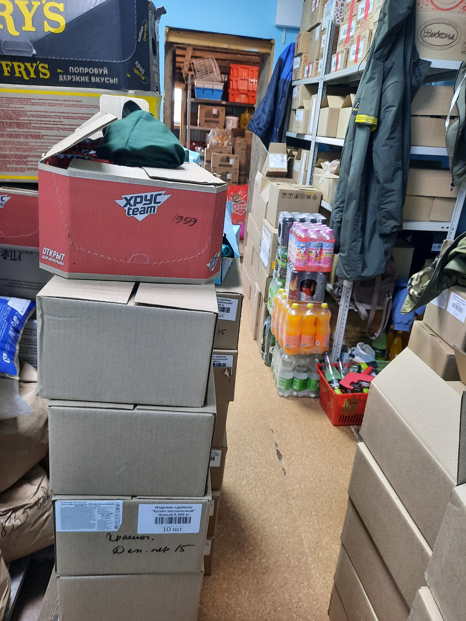The image shows a storage area, likely in Krasnogorskoye, Russia, filled with various items. There are numerous cardboard boxes stacked in rows. Some boxes have labels and writings on them, including…read more