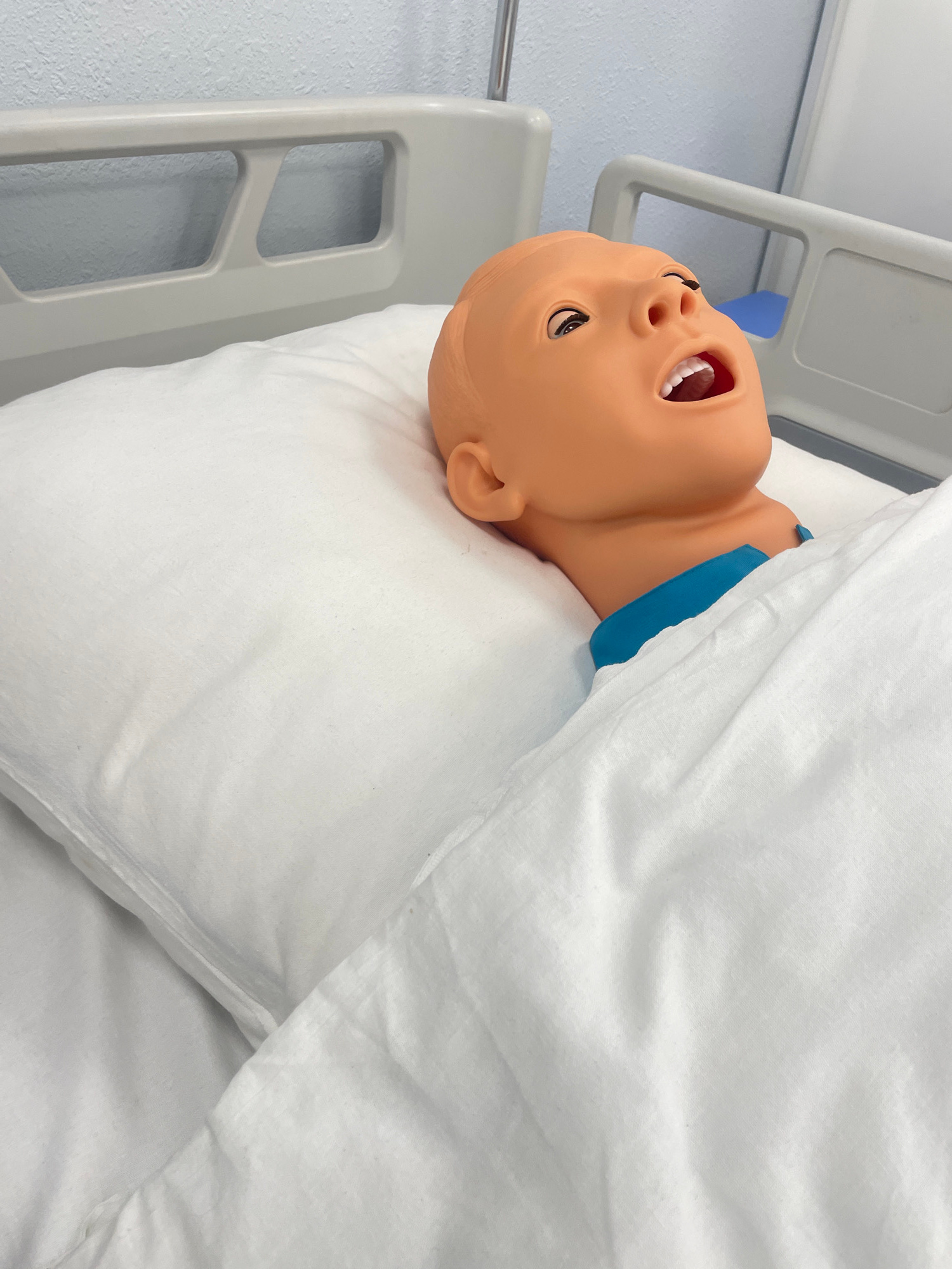 A light-skinned infant mannequin with a blue band around its neck lies in a hospital bed. The mannequin's mouth is open. The mannequin is covered with a white blanket and rests on a white pillow. The…read more