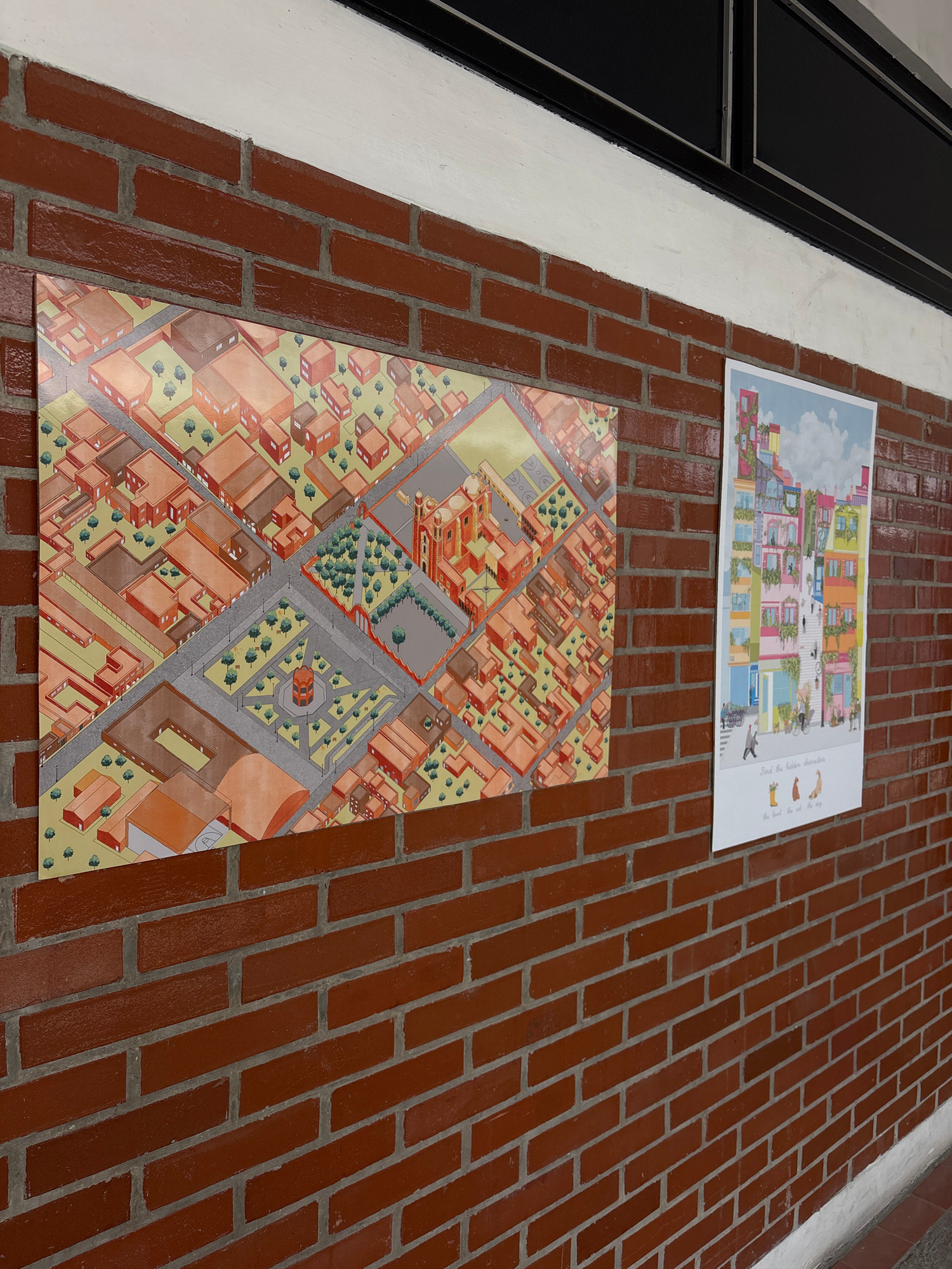 The scene shows a red brick wall with two framed architectural drawings mounted on it. The wall appears to be interior and is adjacent to a white-painted area with a black-framed window or panel. The perspective is slightly low, looking upwards at the wall. The upper drawing depicts a colorful streetscape with multi-story buildings, trees, and illustrations of people and animals. The bottom drawing is an aerial, isometric view of an urban area with buildings, trees, and paved streets. The style of the lower drawing is reminiscent of architectural plans or maps. The location in San Andrés Cholula, Mexico, is not explicitly discernible from the image, but the architectural style in the drawings may suggest Mexican or Latin American influences. No people are visible in the scene. | Open Wire