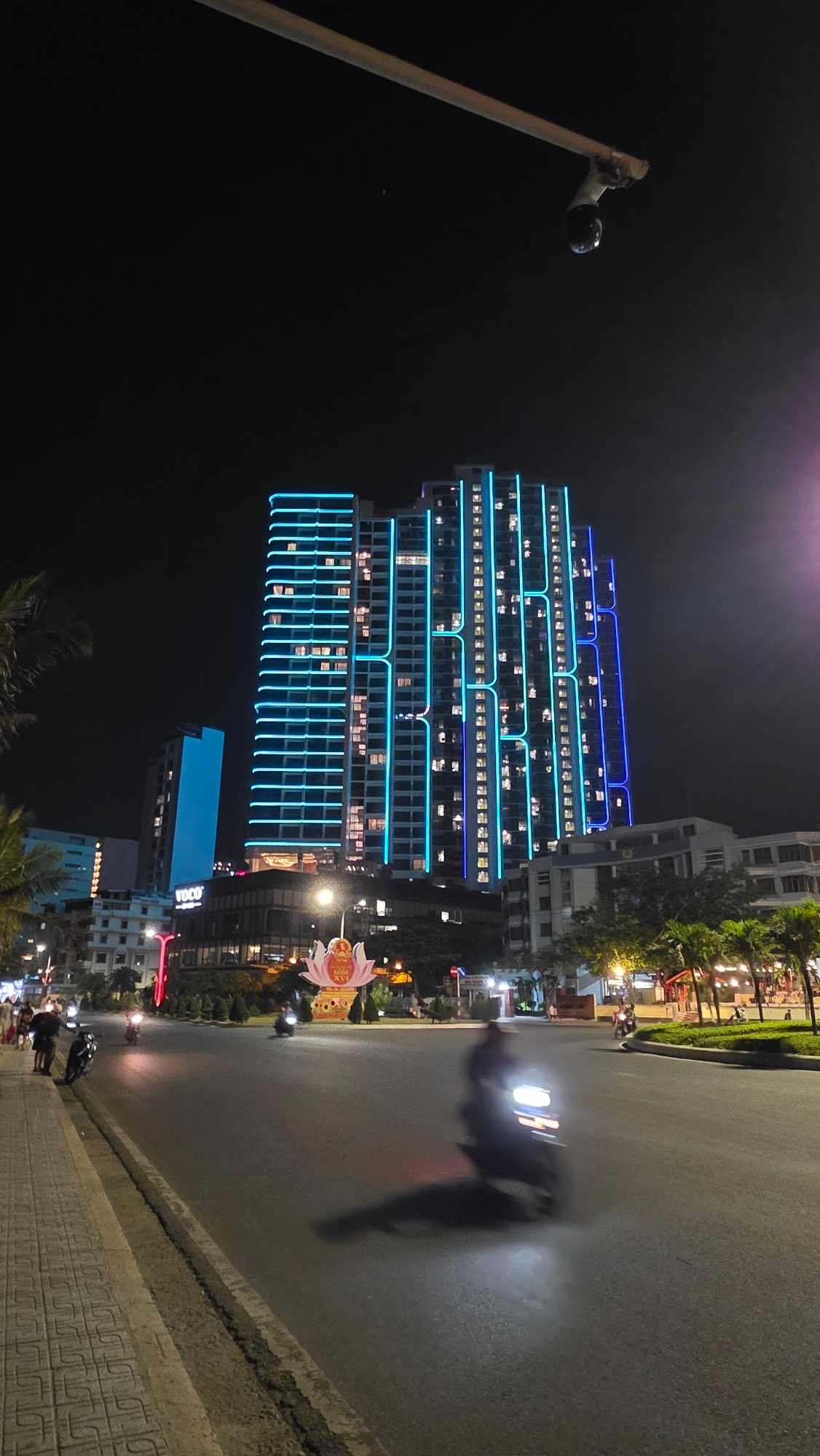 A night-time view of Bắc Nha Trang, Vietnam. The main subject is a tall, modern building illuminated with blue neon lights highlighting its architectural features. The building is multi-storied and ha…read more