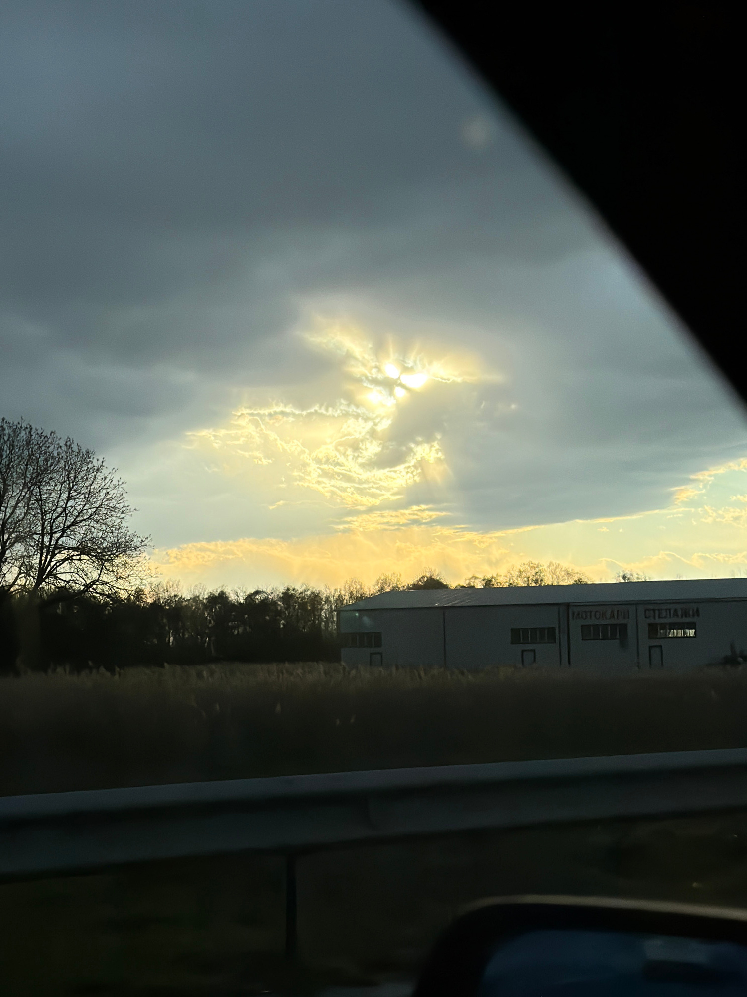 The image, taken from inside a vehicle, depicts a view towards the northeast, through the passenger window. The foreground shows the vehicle's window frame, partially obscuring the view. The middle g…read more