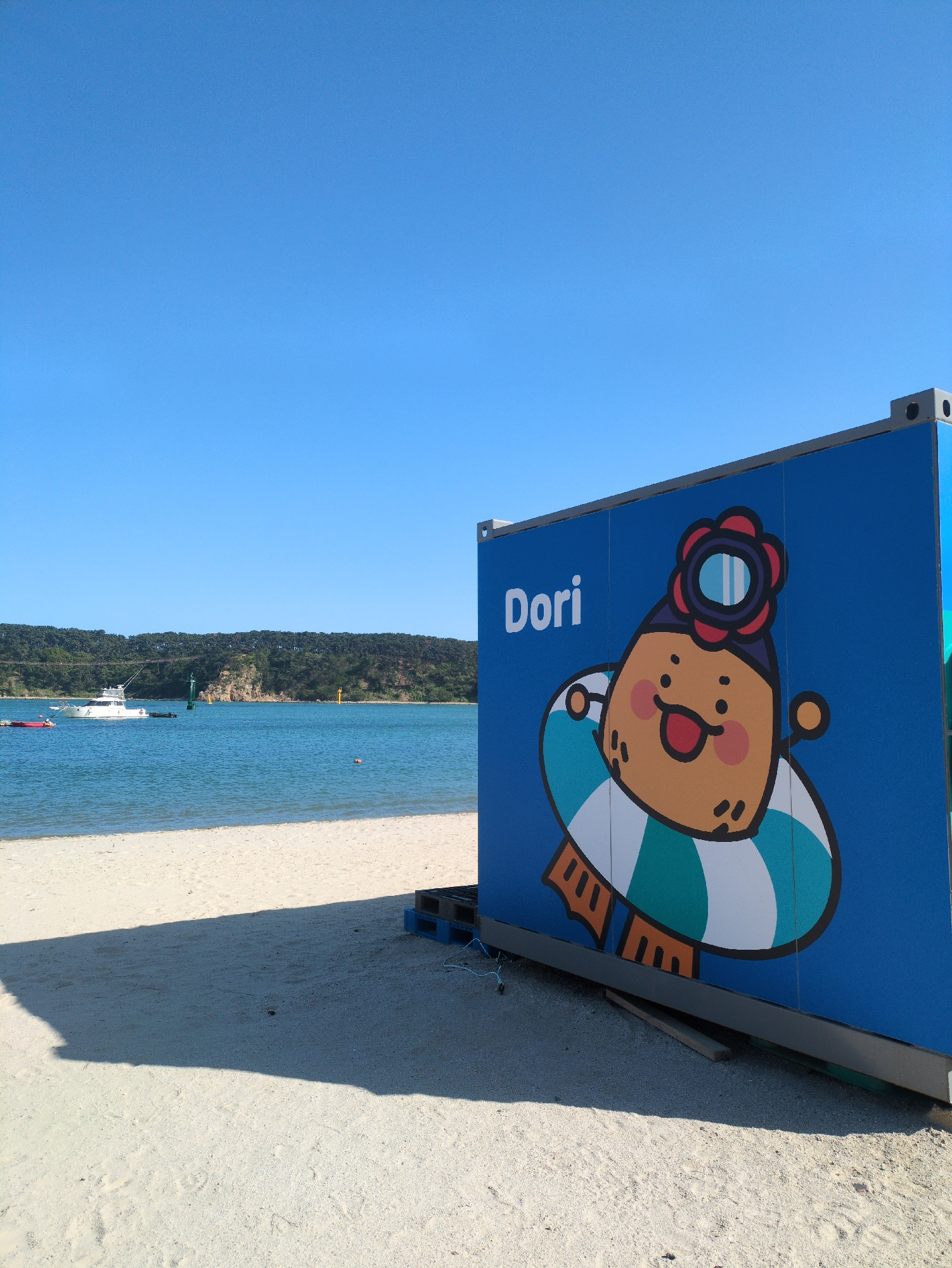 A horizontal eye-level shot of the beach at Ilsan Beach, Ulsan, South Korea, under a bright blue sky. A blue container with an illustration of a cartoon character named Dori wearing a swim ring and go…read more