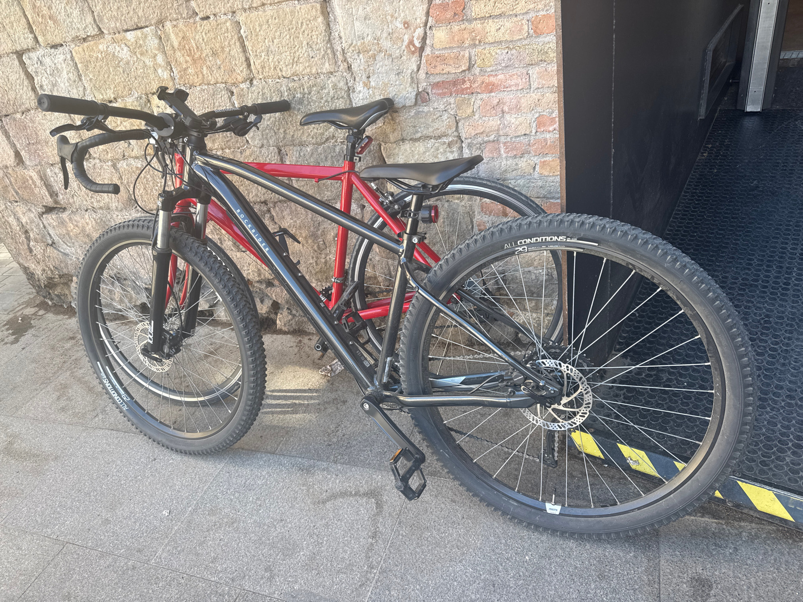 Two bicycles are parked side-by-side, leaning against an old, sun-drenched stone and brick wall. The setting appears to be a street or alleyway in Barcelona, Spain, given the provided context. In the…read more