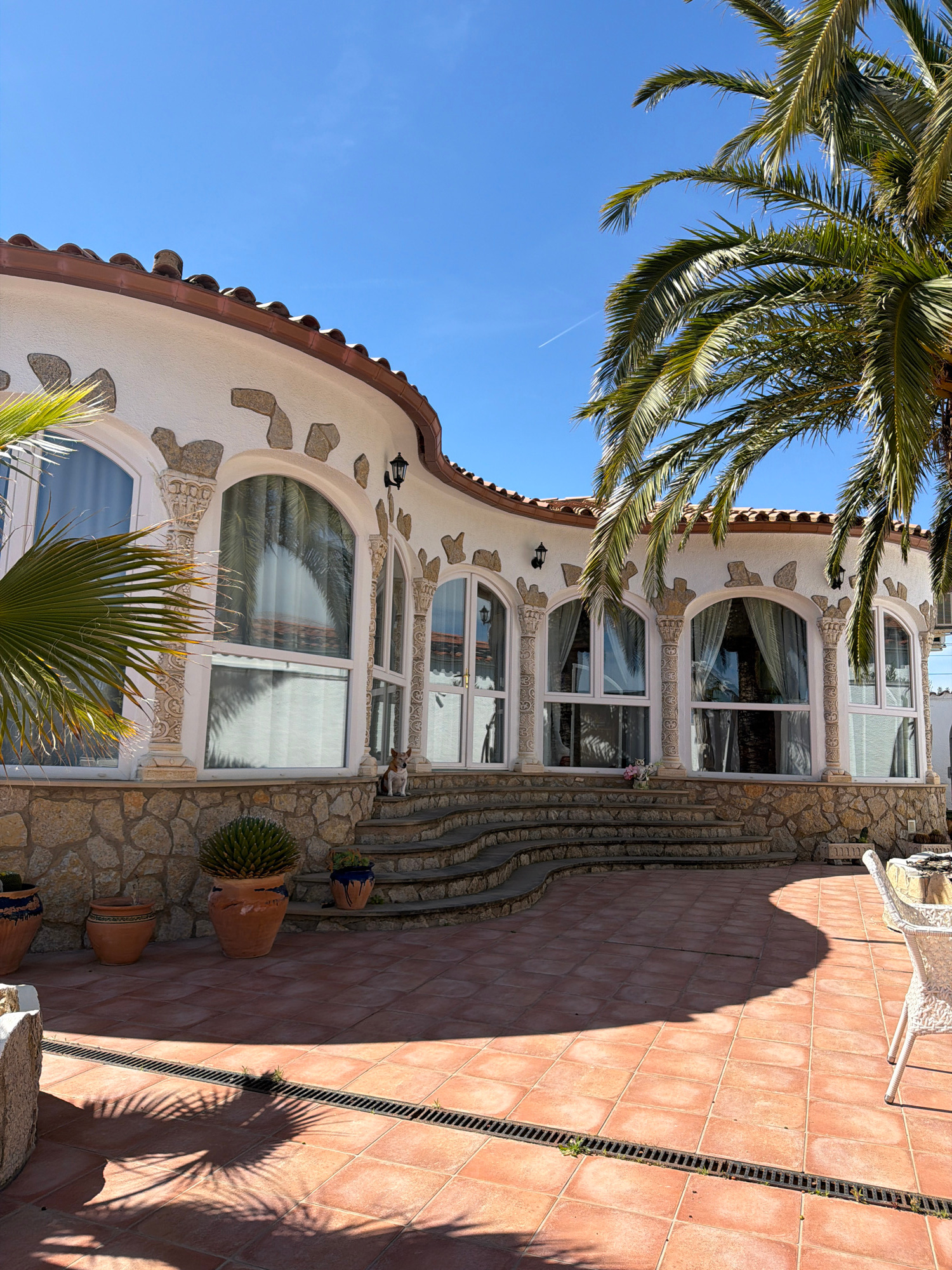 The image shows a curved building in Mont-roig del Camp, Spain, featuring a white facade with stone accents and arched windows. A tiled roof is visible, and the building appears to have multiple stori…read more