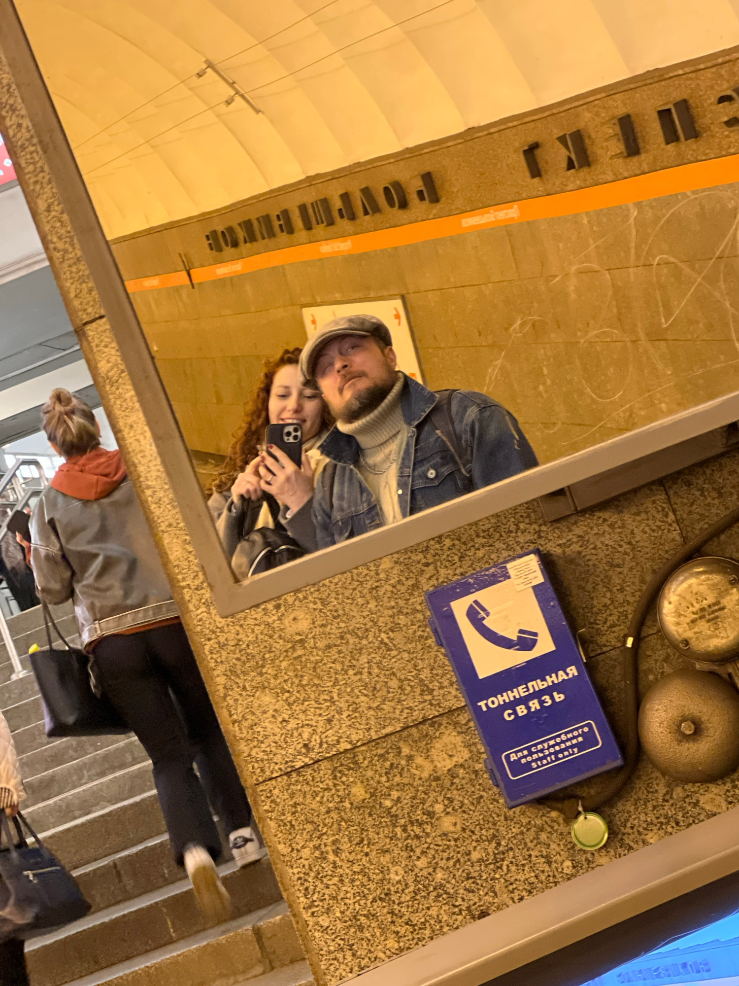 A couple is visible in a mirror. The reflection shows the interior architecture of a Saint Petersburg, Russia, subway station: “Gostiny Dvor.” Visible beside the mirror is an old payphone. A woman is…read more