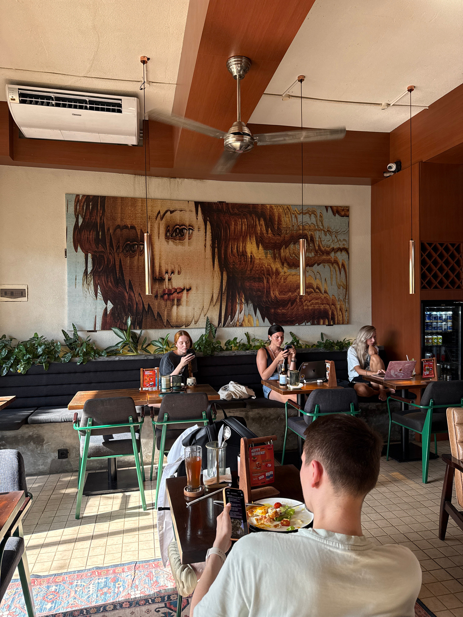 The image shows the interior of a restaurant or cafe in Uluwatu, Indonesia. Several people are seated at tables, appearing to be customers. Some are using laptops and phones, while others have food an…read more