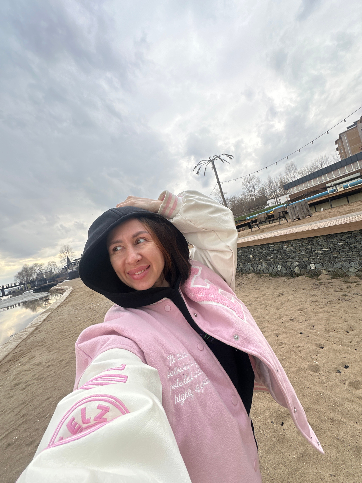 A woman is posing for a selfie at Votkinsk, Russia, near a body of water. She wears a black hooded sweatshirt underneath a pink and white varsity jacket, with the letter “LZ” embroidered on the sleeve…read more