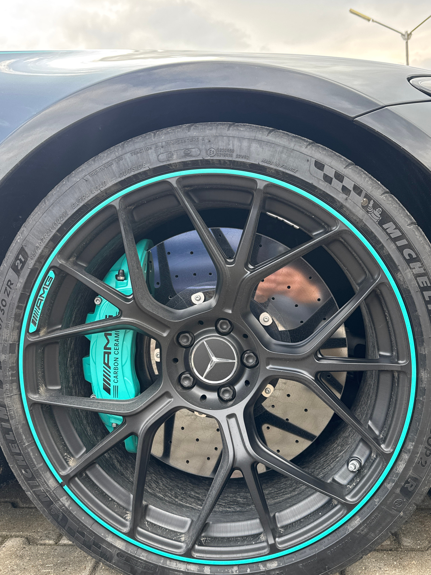 The image provides a detailed close-up of a high-performance car's front wheel, tire, and braking system, captured in Razlog, Bulgaria. The main subject is a black, multi-spoke alloy wheel with a stri…read more