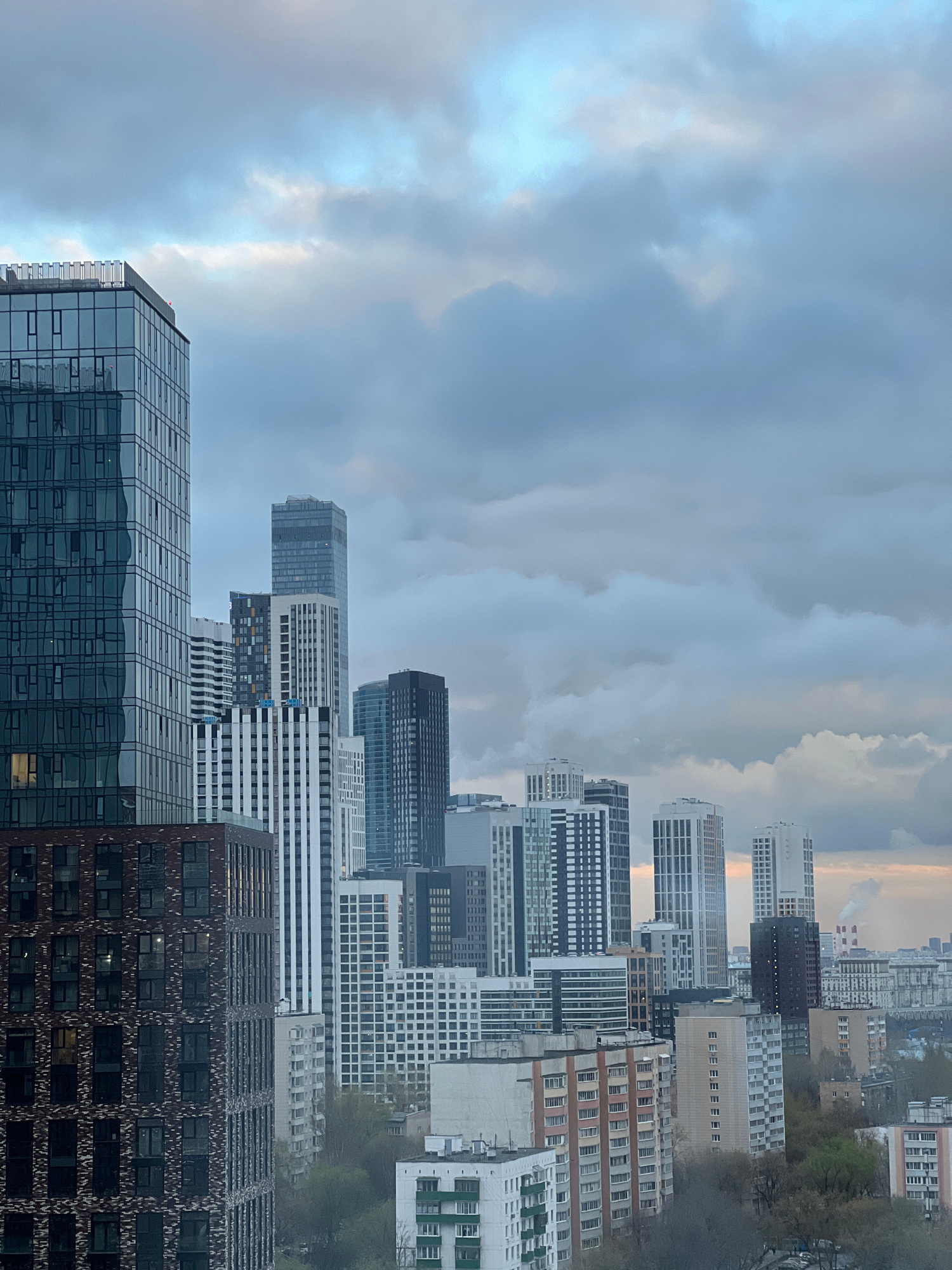 The image depicts a dense urban landscape under a cloudy sky. In the foreground are several buildings, one with a reflective glass facade and another with a dark, patterned exterior. Numerous high-ris…read more