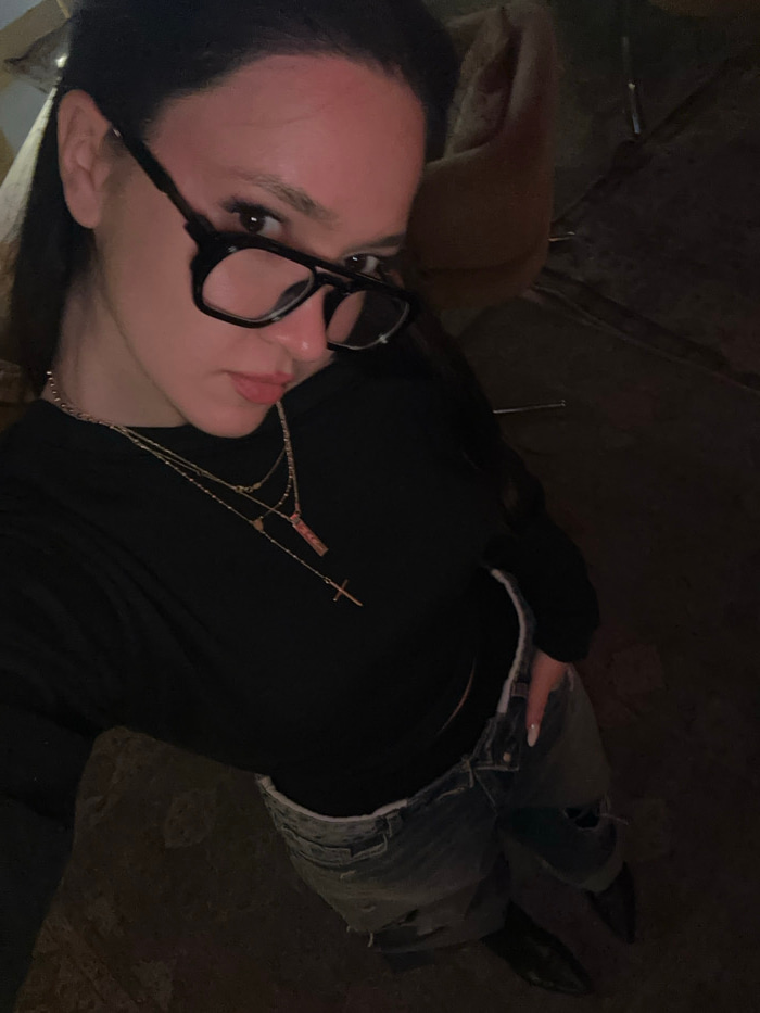 The image presents a female individual in a high-angle, full-body self-portrait. She possesses dark hair and wears black-framed eyeglasses. Her attire includes a long-sleeved black top, light-wash disβ¦read more