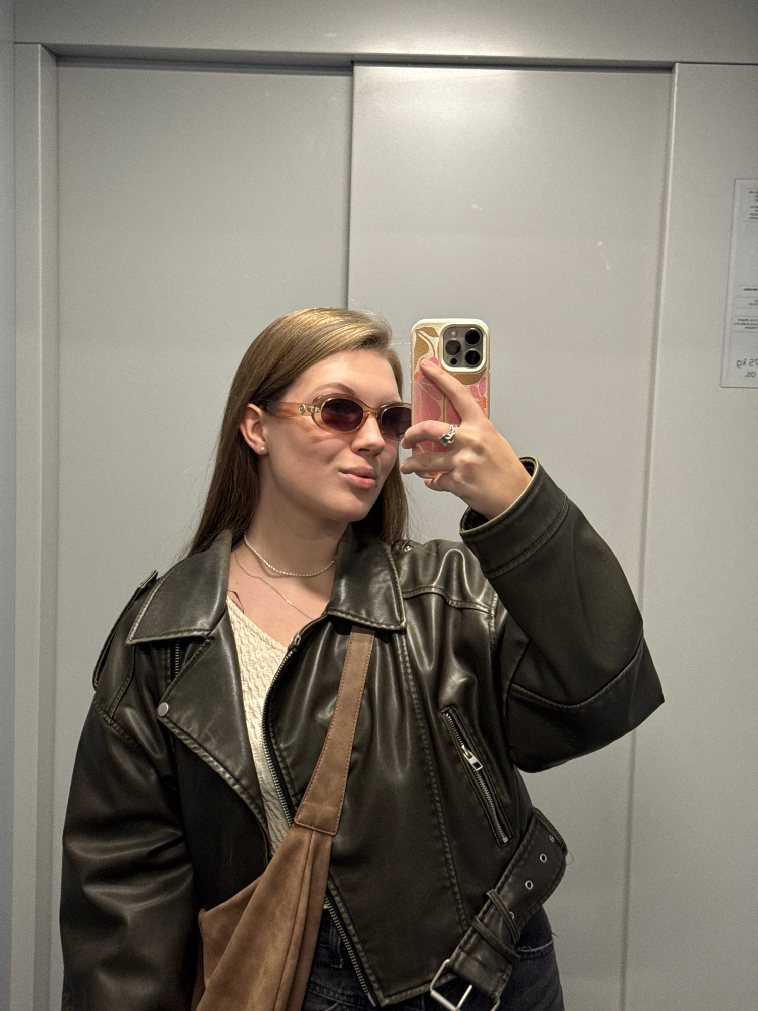 A young woman with long brown hair, wearing brown-tinted sunglasses, a brown leather jacket, and a light-colored top, takes a selfie. She is holding a mobile phone with a patterned case. The backgroun…read more