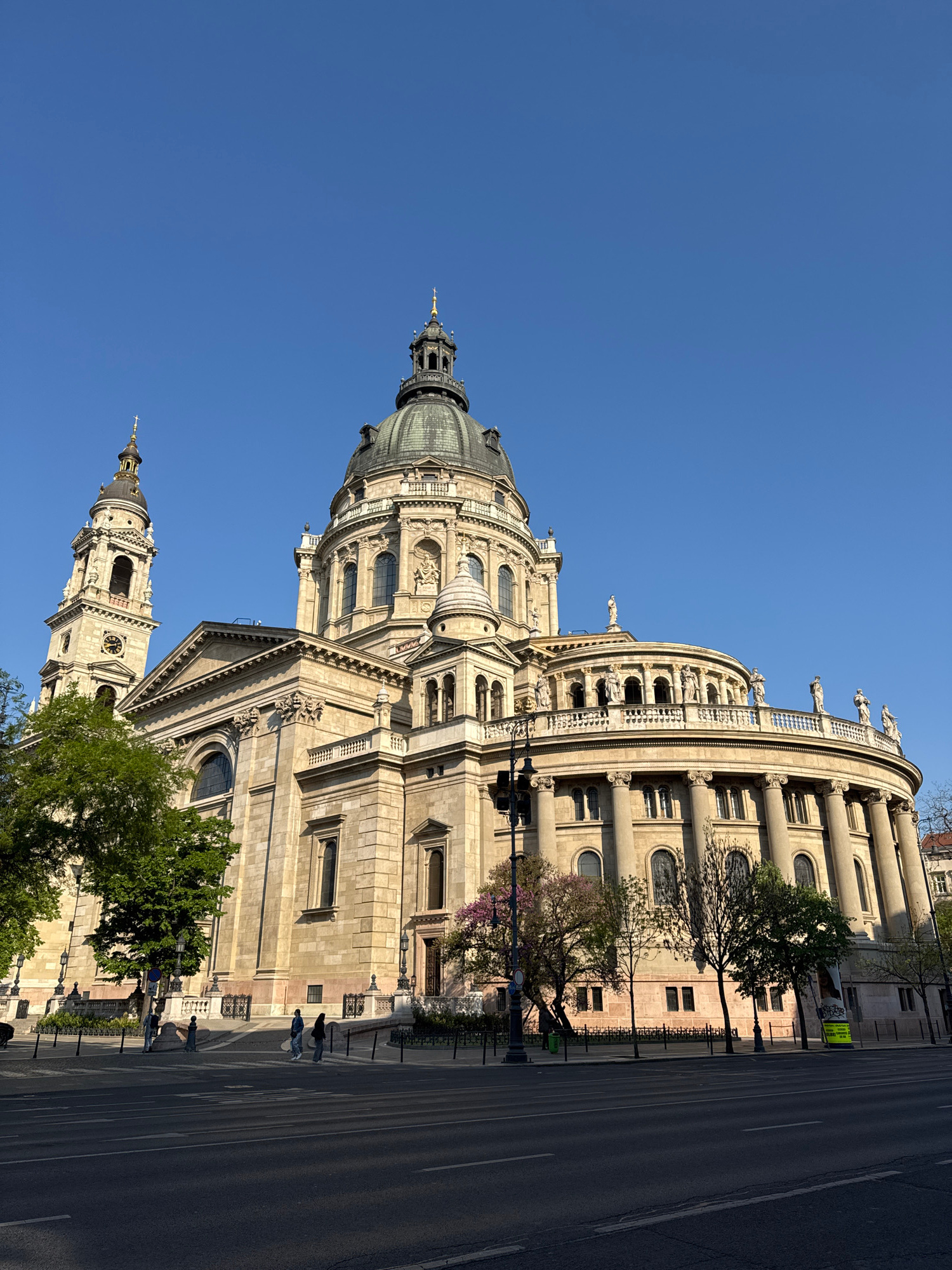 This image shows St. Stephen's Basilica in Budapest, Hungary. The basilica is a large, ornate building with a prominent dome and a tower visible in the bottom left. The facade is made of light-coloredβ¦read more