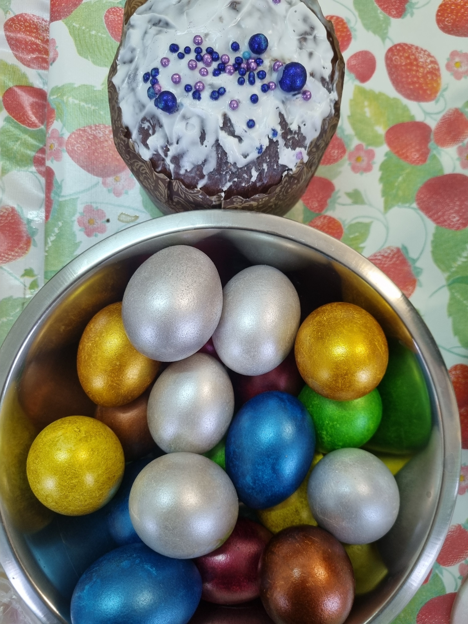 A close-up shot depicts a brightly lit scene with a bowl of multi-colored, metallic-looking eggs and a decorated cake on a strawberry-patterned tablecloth. The eggs are a mix of colors including silve…read more