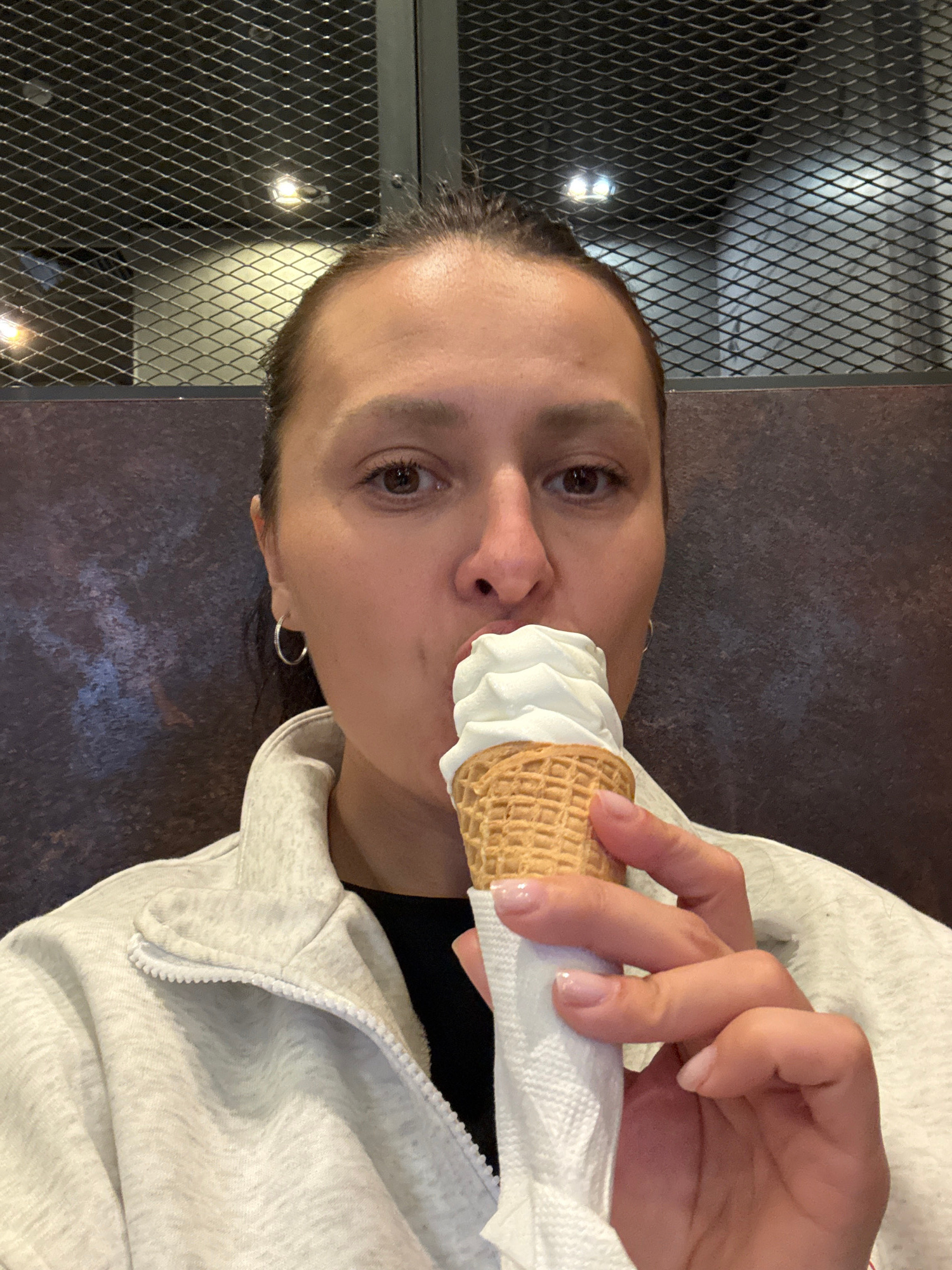 A woman holds an ice cream cone to her mouth in an indoor setting. She wears a light grey zip-up hoodie and has hoop earrings. The background includes a wall with a metal grate and a darker, textured…read more