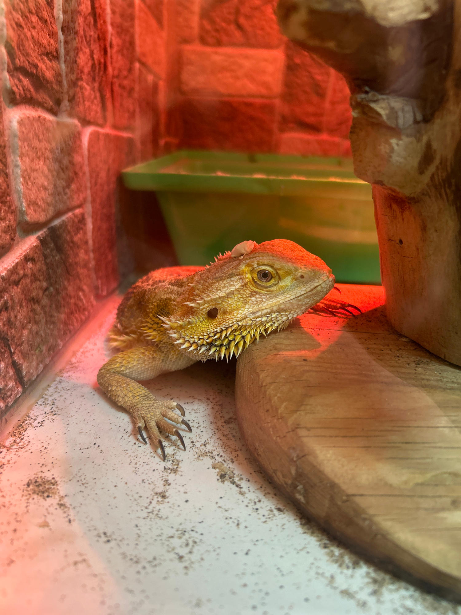 A bearded dragon is perched inside an enclosure. The dragon is positioned between a wooden structure and a white, mottled wall. Its claws are visible, gripping the wall. The enclosure floor is made of…read more