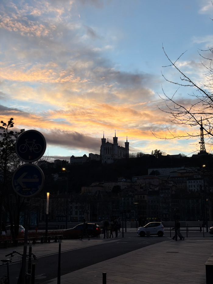 A picturesque dusk cityscape is captured with a dramatic sky of blues, oranges, and grey hues. A prominent church with pointed towers sits atop a hill. The city skyline includes building silhouettes,…read more