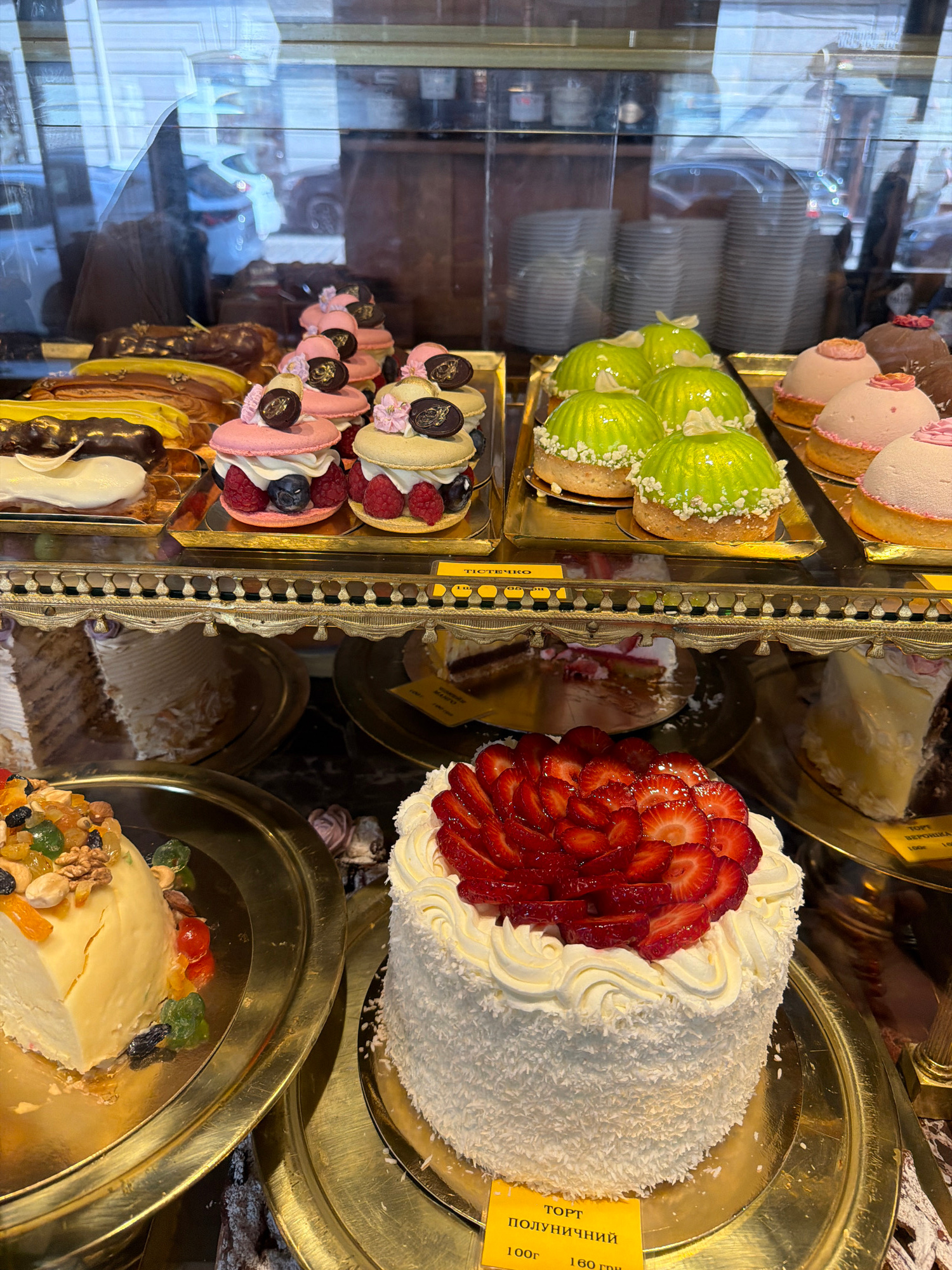 This image displays a vibrant selection of pastries and cakes inside a brightly lit display case, likely in a bakery or cafe. The image is oriented vertically, showing the desserts arranged on multipl…read more