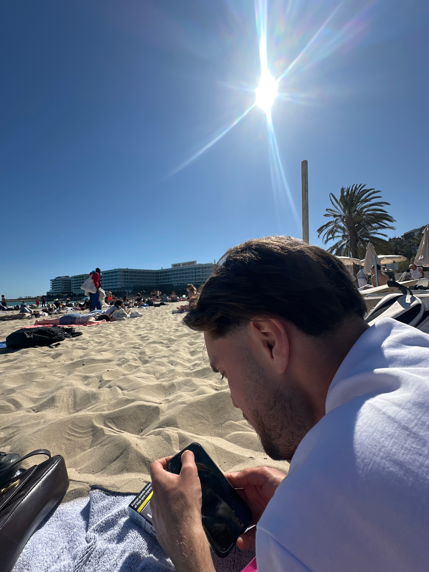 A low-angle, upward-tilted shot captures a man on a crowded beach in Alicante/Alacant, Spain. He is holding a black smartphone, looking at the screen. The beach sand has wave-like patterns. Next to th…read more