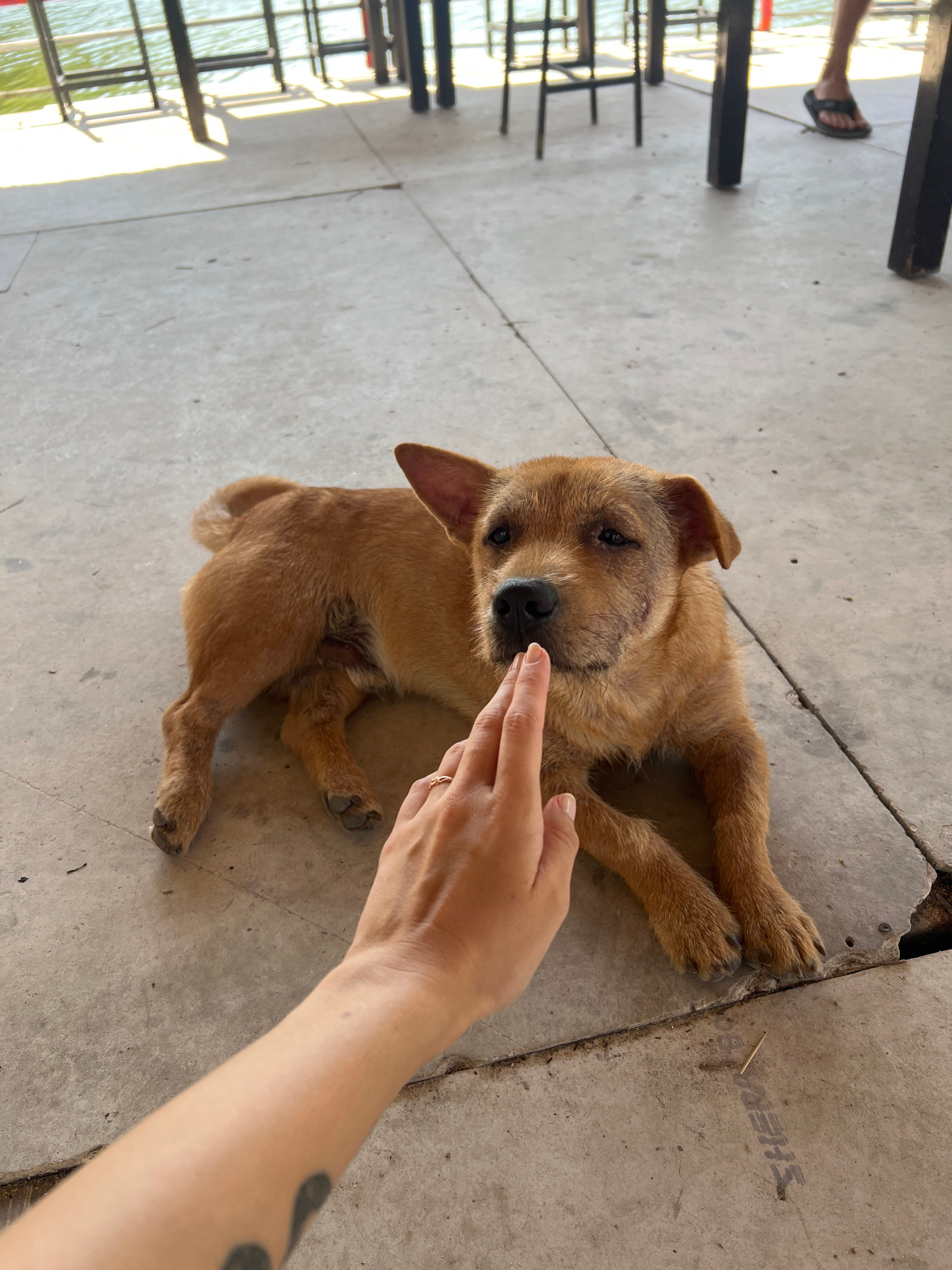 The image displays an overhead view of a casual outdoor scene at a waterfront establishment in Nha Trang, Vietnam. A medium-sized, light brown, short-haired dog lies on a light grey concrete patio, fa…read more