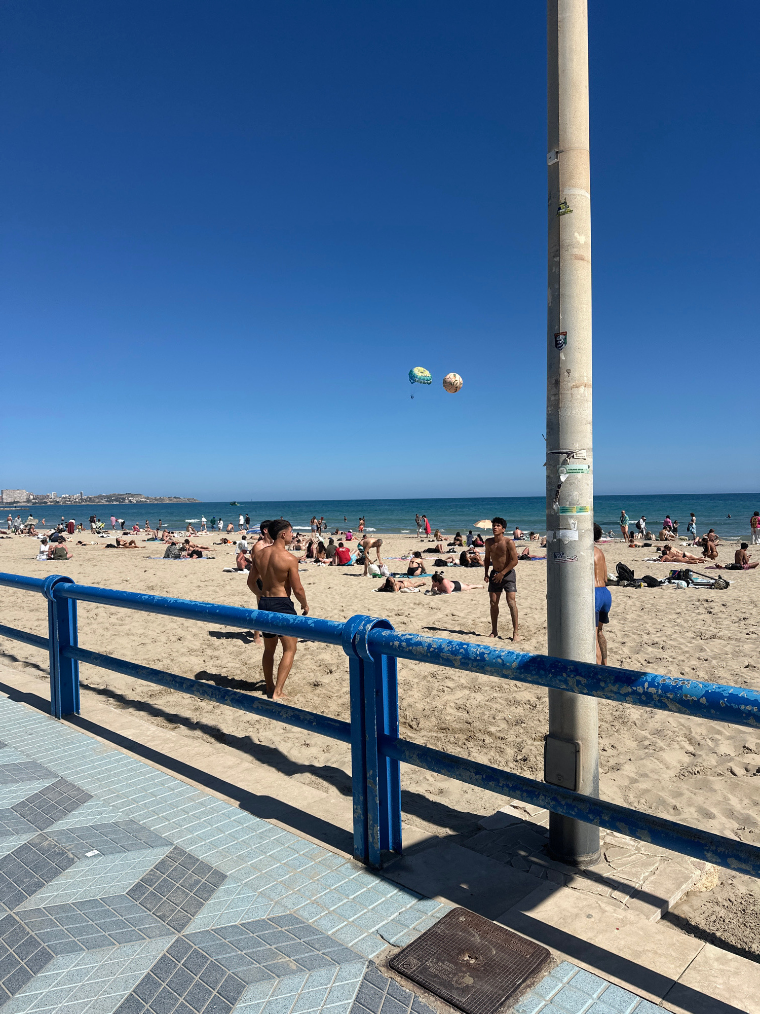 The image shows a beach scene in Alicante, Spain, with numerous people sunbathing and relaxing on the sandy shore. A blue metal railing and a concrete pole are visible in the foreground. In the sky, t…read more