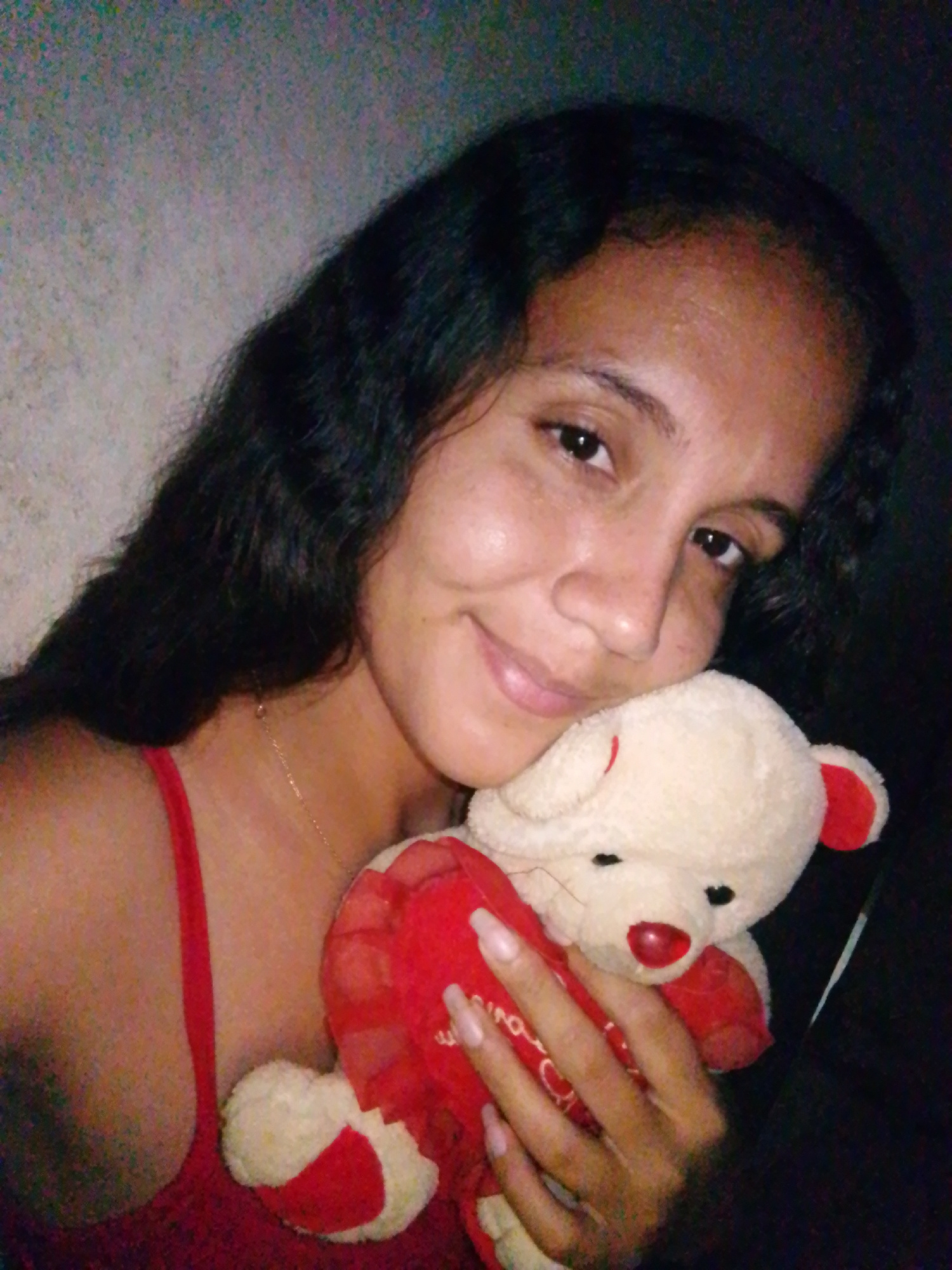 A woman with dark hair and skin is holding a stuffed bear. She is wearing a red top. The background appears to be a wall or dim interior space. The location information is not discernible from the ima…read more