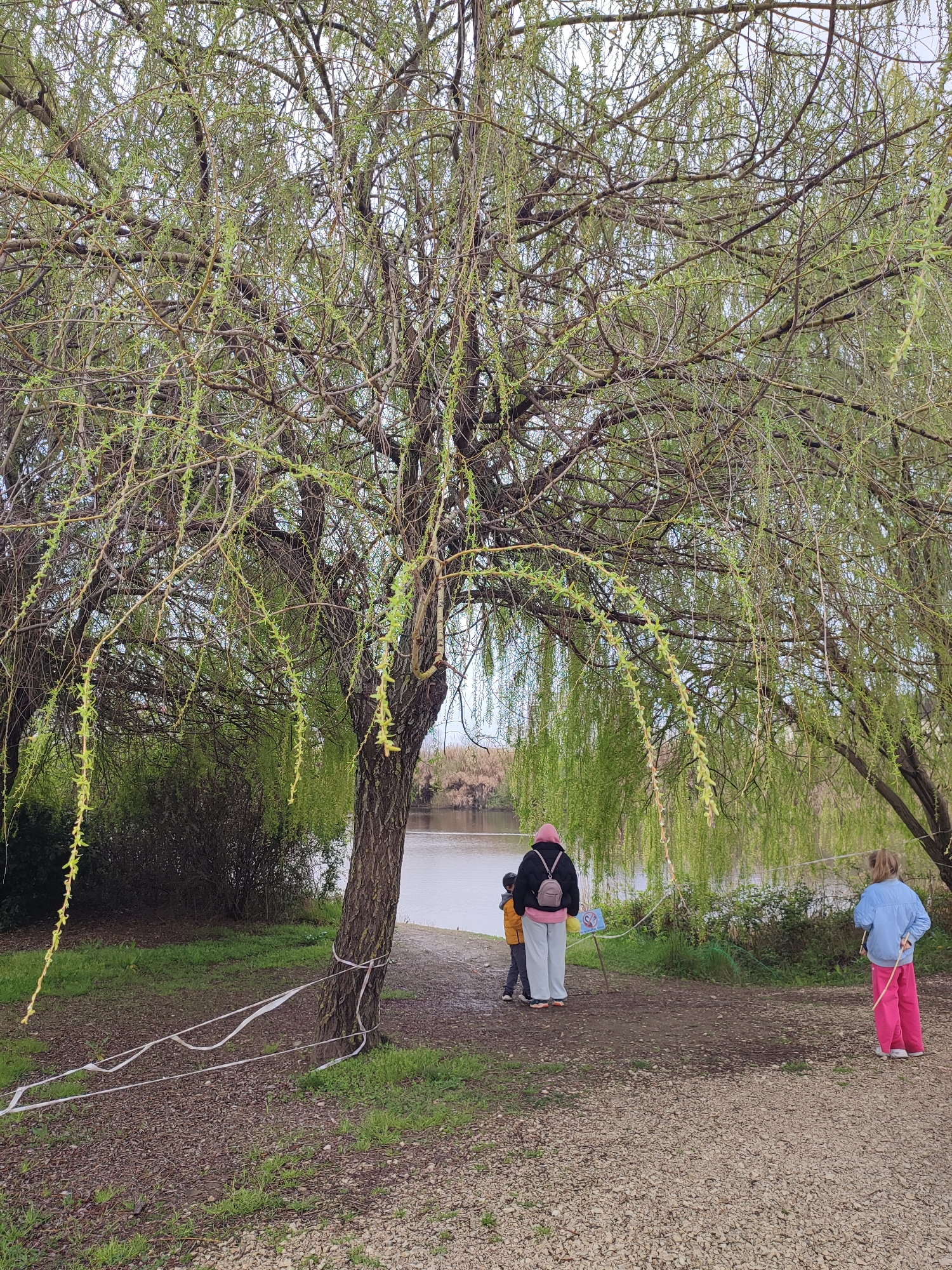 A medium shot depicts a scene in an outdoor, likely lakeside area near Sochi, Russia. A large willow tree with light green foliage dominates the left side of the frame, its branches cascading downward…read more