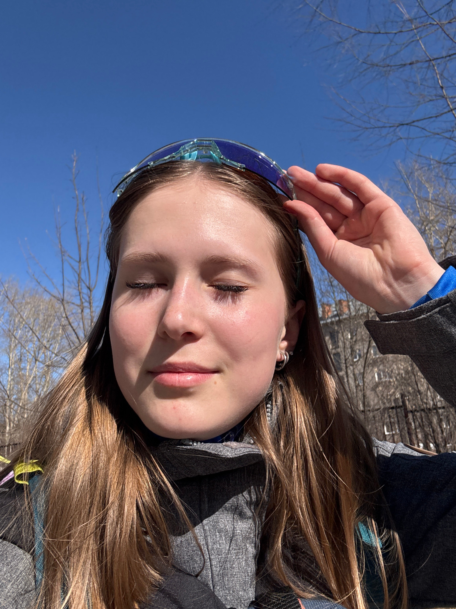 A medium shot of a person with fair skin and long brown hair, positioned outdoors against a bright blue sky partially obscured by bare tree branches. The person is wearing blue-tinted goggles pushed b…read more