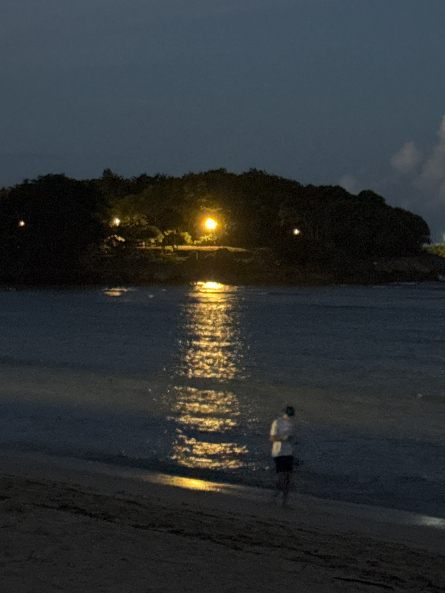 At night in Unknown, Indonesia, a beach scene unfolds. Two individuals, one in a light top and the other in a dark bottom, stand on the shoreline, their forms blurred by the low light. The sea reflect…read more
