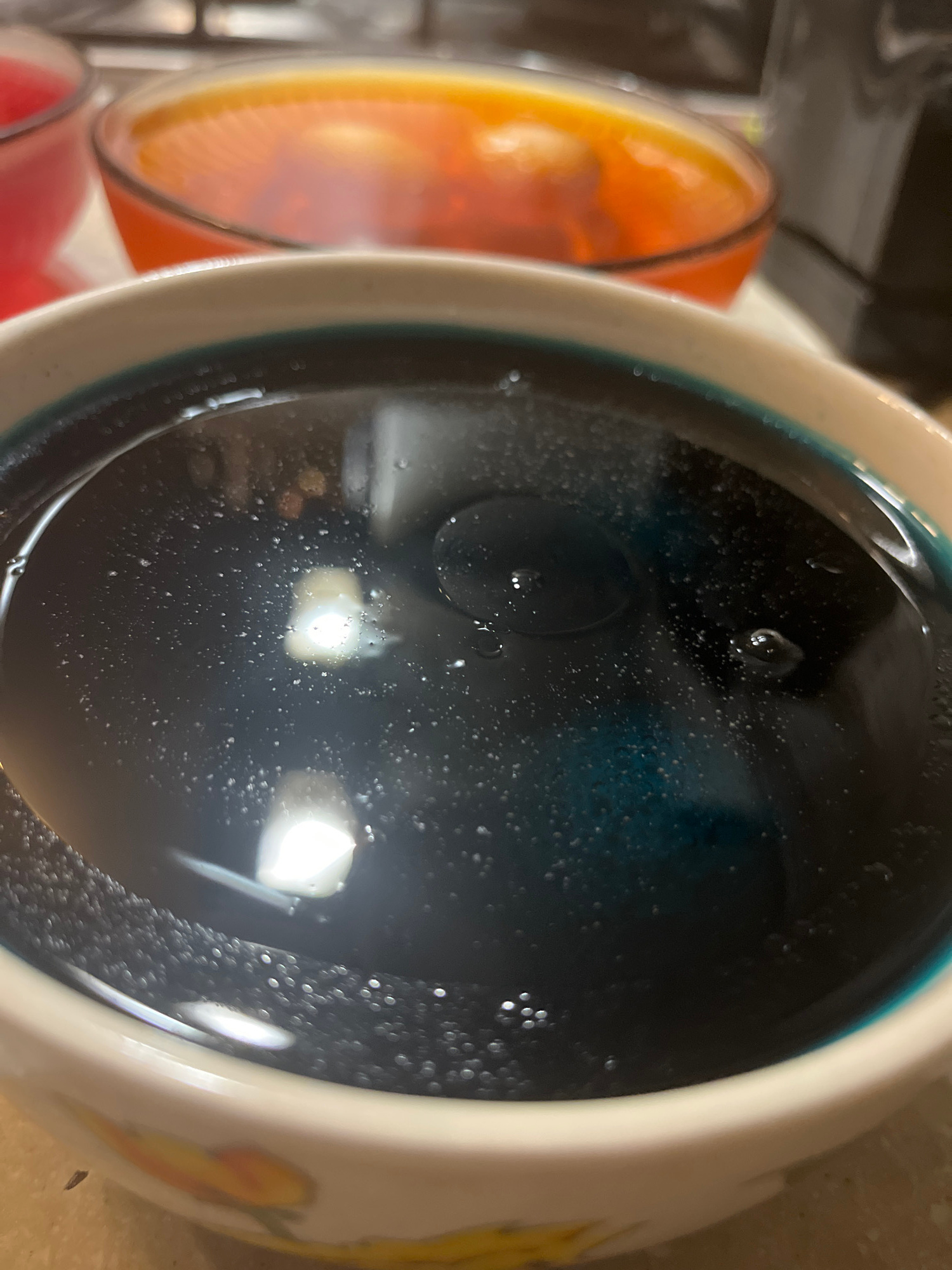 A close-up, canted perspective image depicts a white mug filled with a dark blue liquid, likely a dye solution. The mug's rim is lined with a thin blue band. Bubbles adhere to the inside surface of th…read more