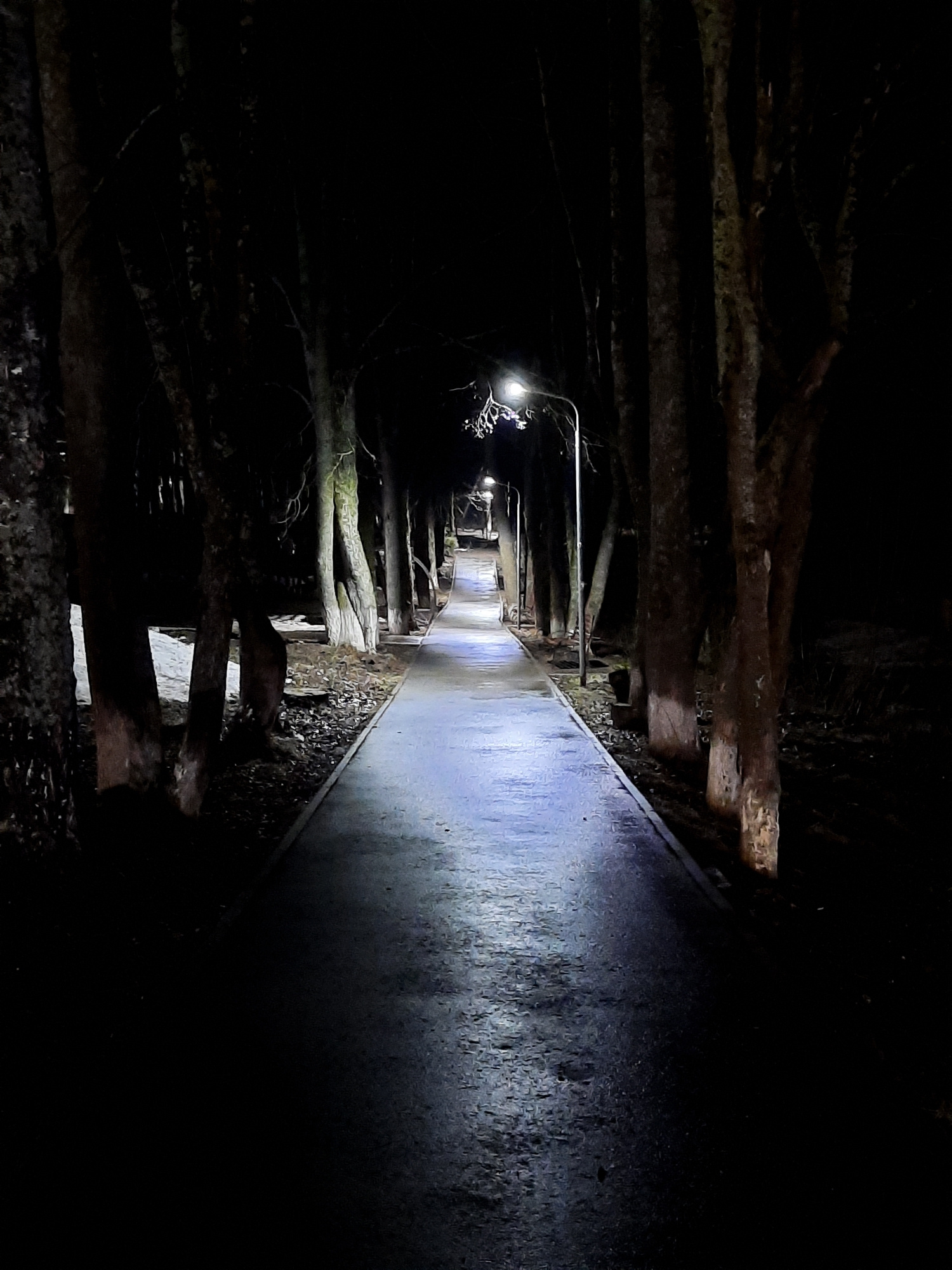 The image depicts a dark, narrow walkway or tunnel-like structure in an unspecified location in Krasnogorskoye, Russia. The walkway is bordered on the right by a smooth, light-colored surface, possibl…read more
