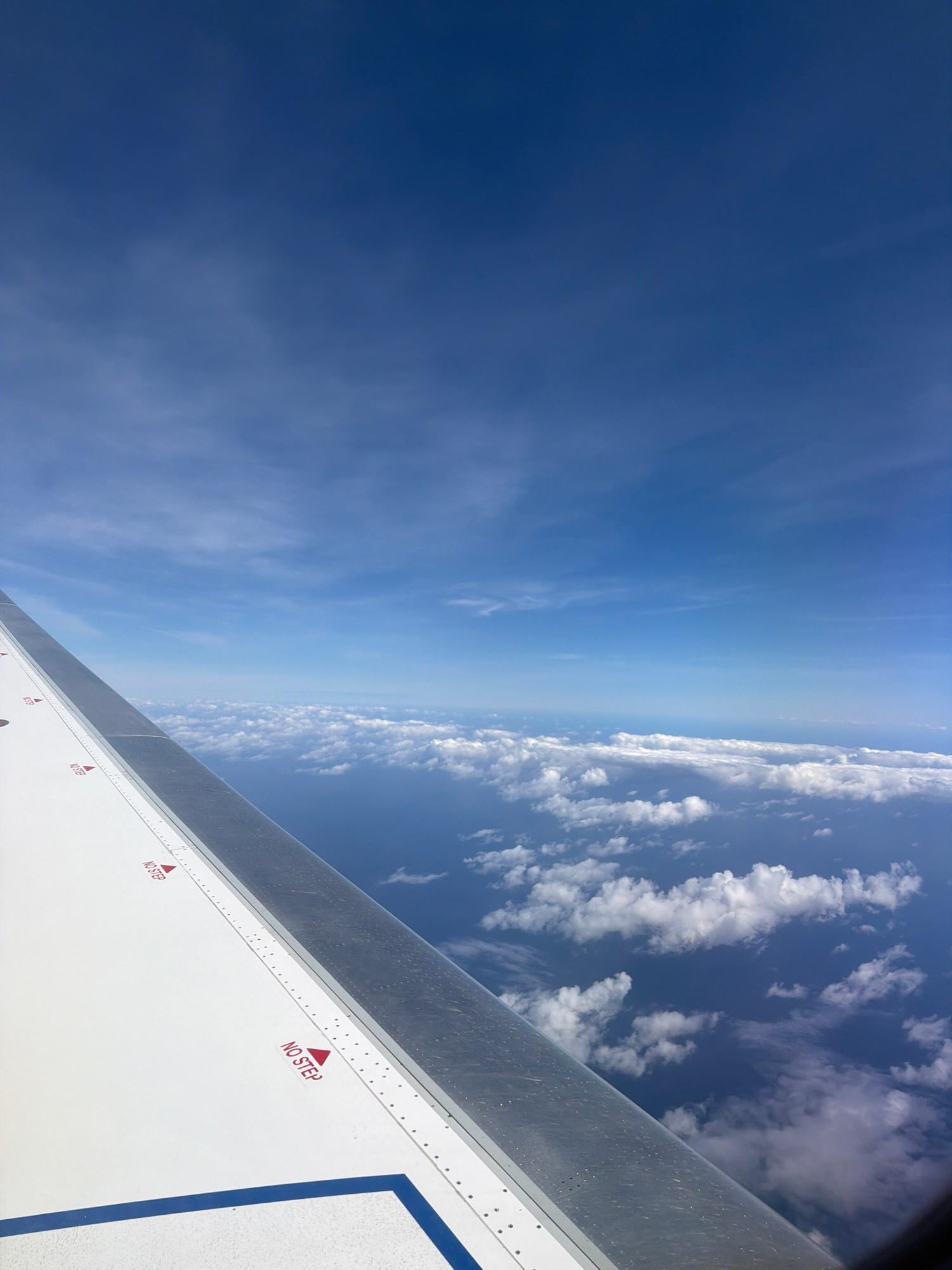 An aerial photograph captures a view from an aircraft in flight, with the left wing dominating the lower-left to mid-right diagonal portion of the frame. The foreground section of the wing is white, d…read more