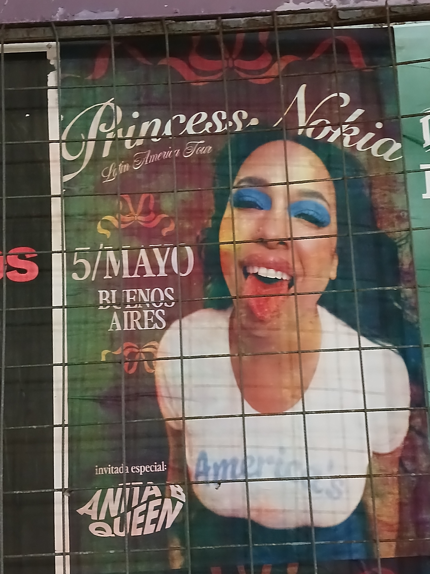 The image shows a poster for Princess Nokia's "Latin America Tour," dated May 5 in Buenos Aires, with a special guest, Anitar Queen. The poster is partially obscured by a metal grate.