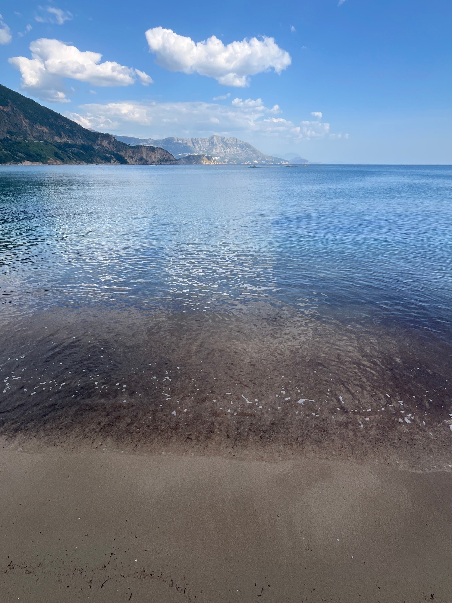 The image displays a serene coastal or lakeside landscape under a bright, clear blue sky with scattered white cumulus clouds. The perspective is from the water's edge, looking out across a body of wat…read more
