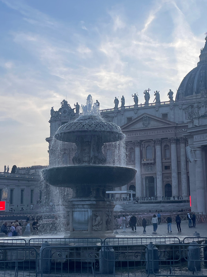 A large, two-tiered stone fountain, actively spouting water from its upper basin into a larger lower basin and overflowing, is centrally positioned in the foreground and mid-ground of an outdoor scene…read more