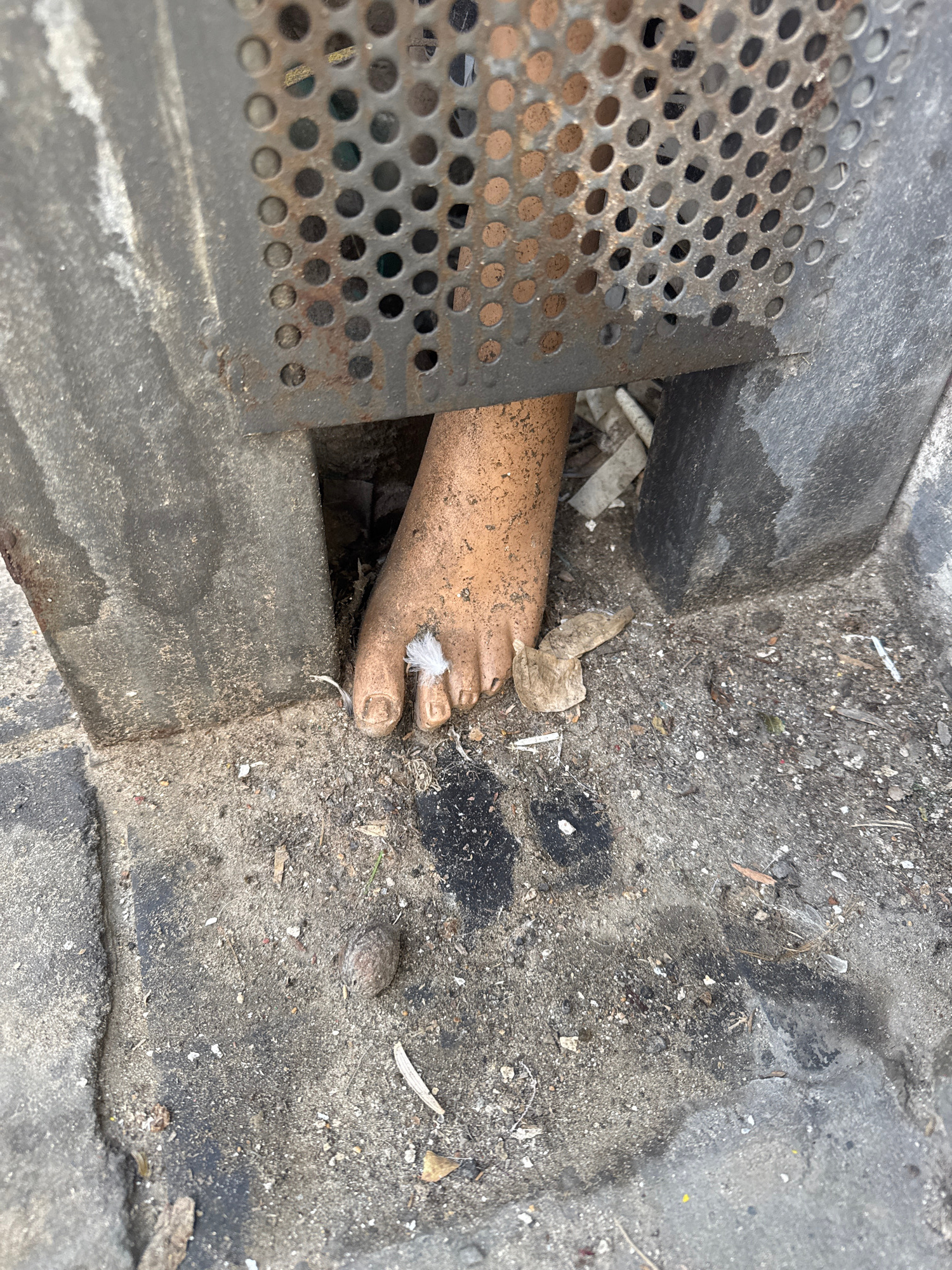 The image shows a disembodied mannequin foot partially lodged in a metal storm drain or street gutter. The foot is tan-colored, suggestive of fair skin, and appears slightly dirty or weathered. A smal…read more