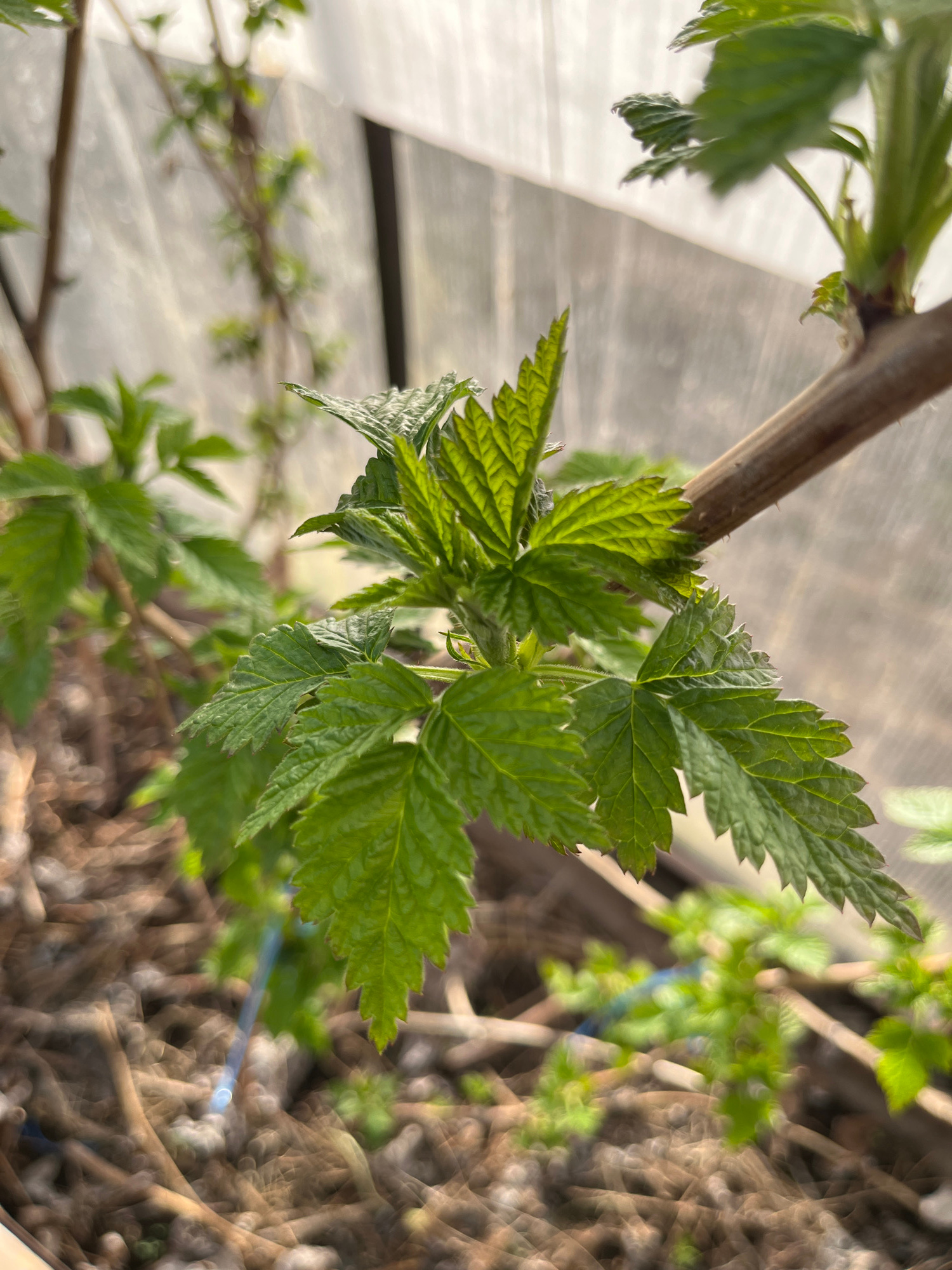 A close-up, vertically oriented photograph captures the vibrant, new growth of a plant branch, likely a raspberry bush, in Chaikovsky, Russia. The primary subject is a cluster of bright green, freshly…read more