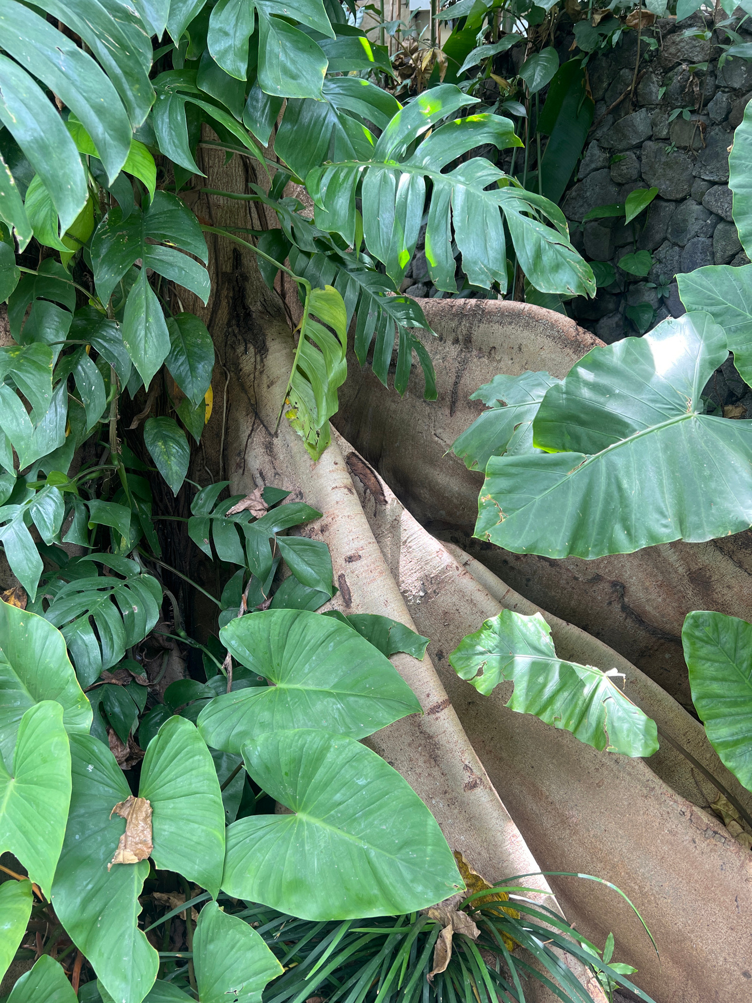 The image shows a close-up view of dense tropical vegetation, likely in Kerobokan, Indonesia. A thick, tan-colored tree root or base structure is the central element, around which various green plants…read more