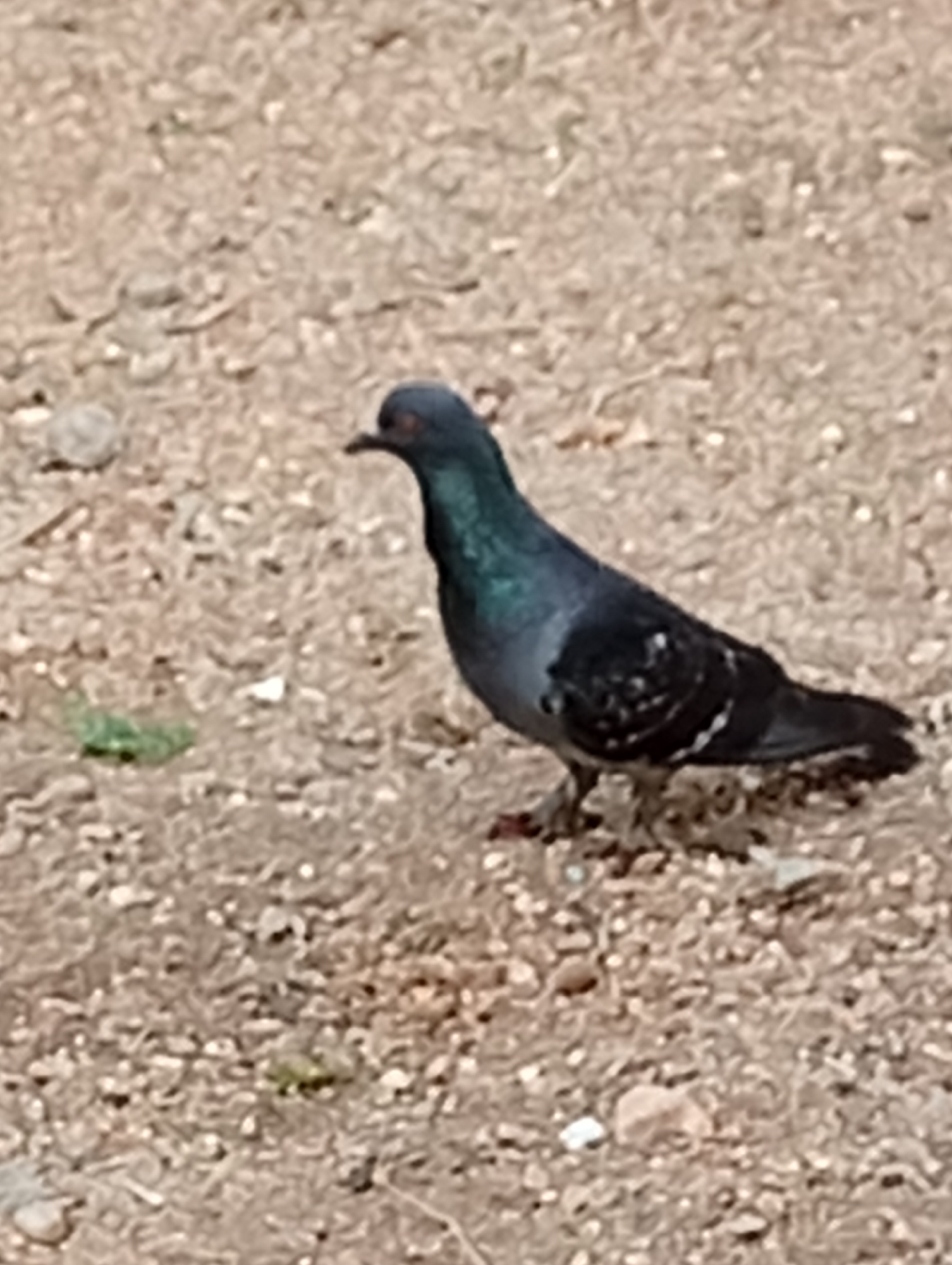 A pigeon stands on a gravelly surface. The bird is primarily gray and black with iridescent green and purple feathers around its neck. The background consists of small rocks and pebbles in shades of b…read more