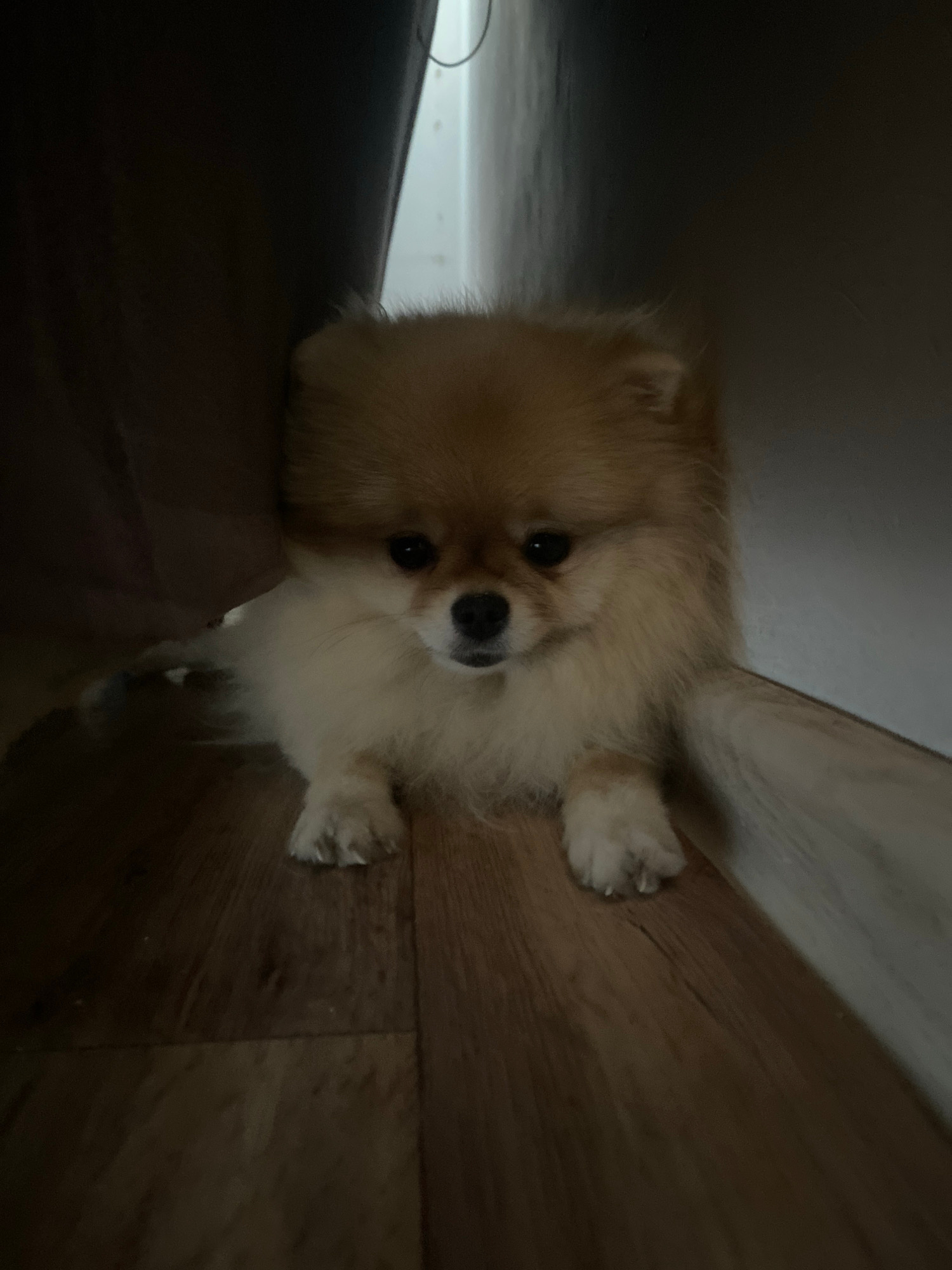 A tan Pomeranian dog is lying on its side on a wooden floor, partially underneath a dark object. The dog is looking directly at the camera with its black eyes and nose. The lighting is dim, and the en…read more