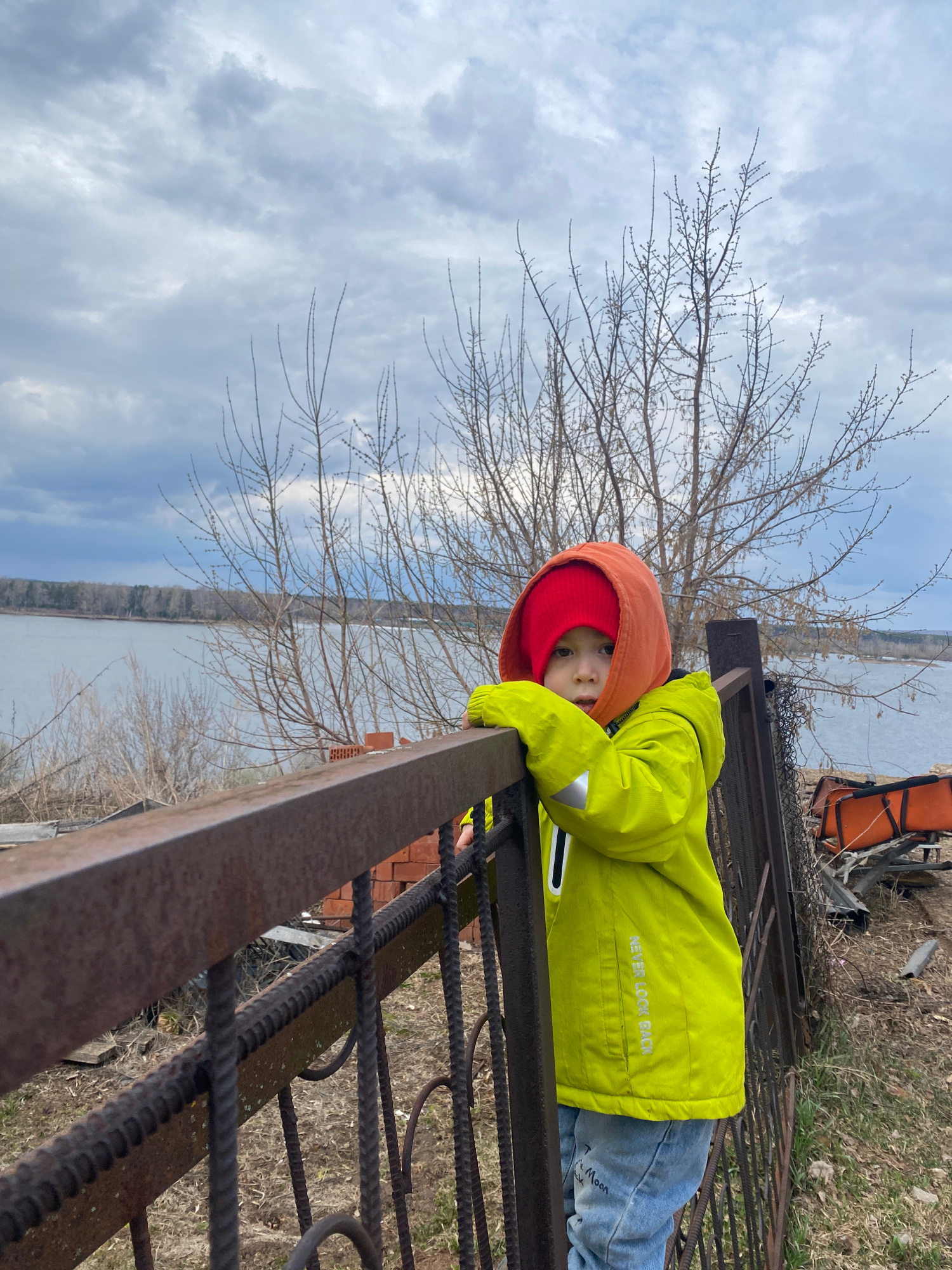 A young child, wearing a lime green jacket with the words "NEVER LOOK BACK" on the back, an orange hood, and a red hat, is leaning over a rusted metal fence. The child is looking towards the camera. B…read more