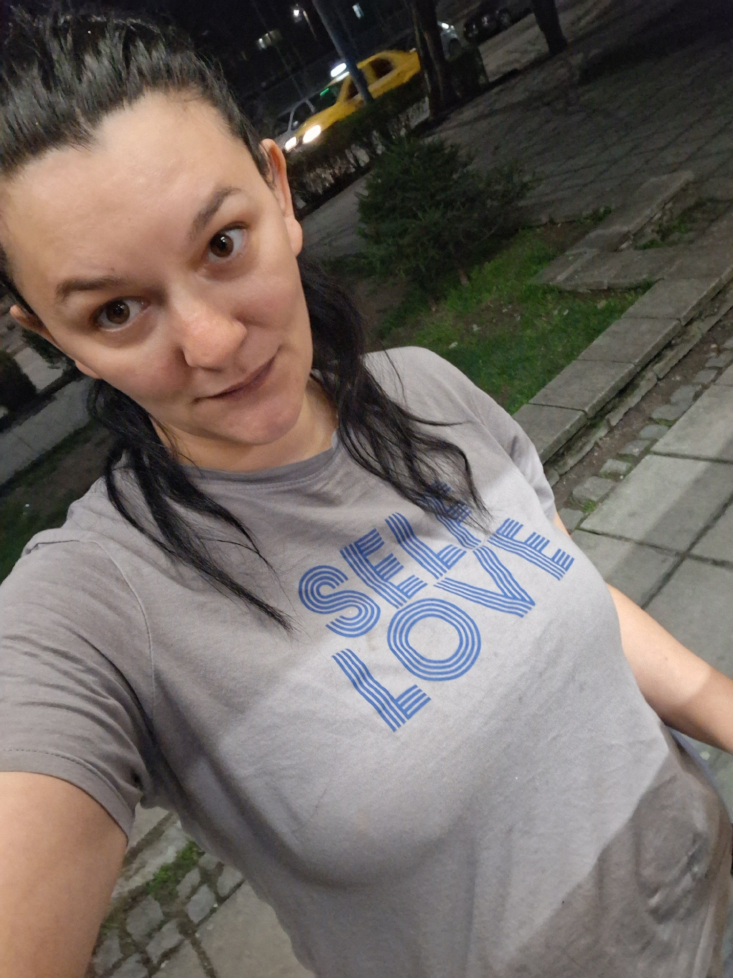 A selfie of a woman is centered in the frame, taken outside in a possible city location. The woman has dark hair pulled back, brown eyes, and is wearing a gray T-shirt with the word "LOVE" in blue let…read more