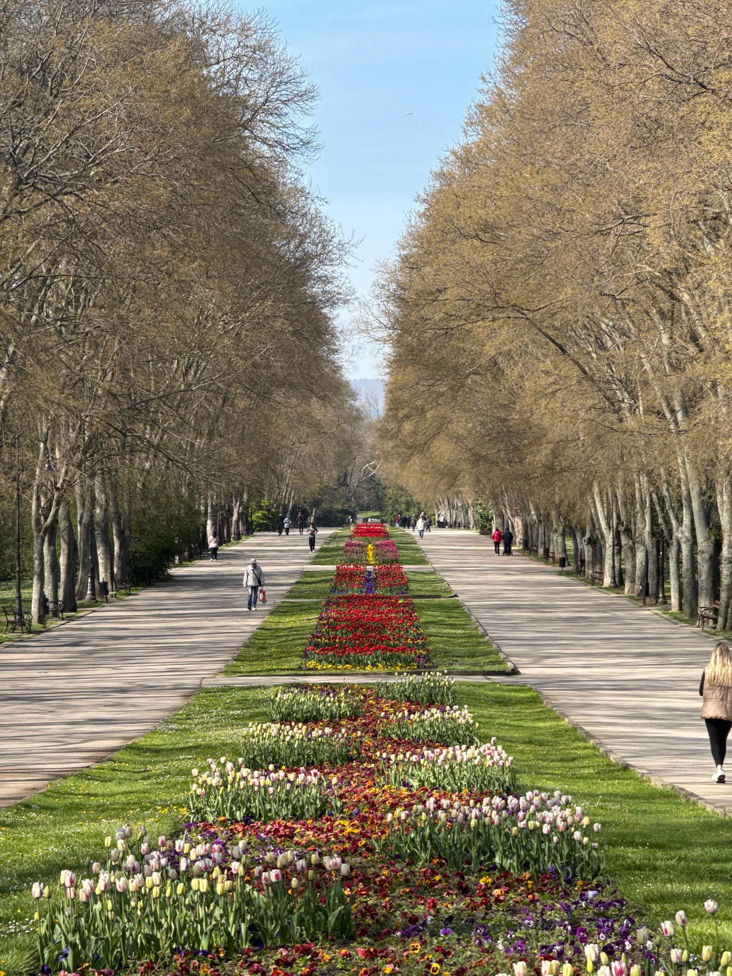 The image captures a wide, straight promenade or avenue extending into the distance under a clear blue sky. The paved pathway is flanked on both sides by rows of mature, deciduous trees with bare bran…read more
