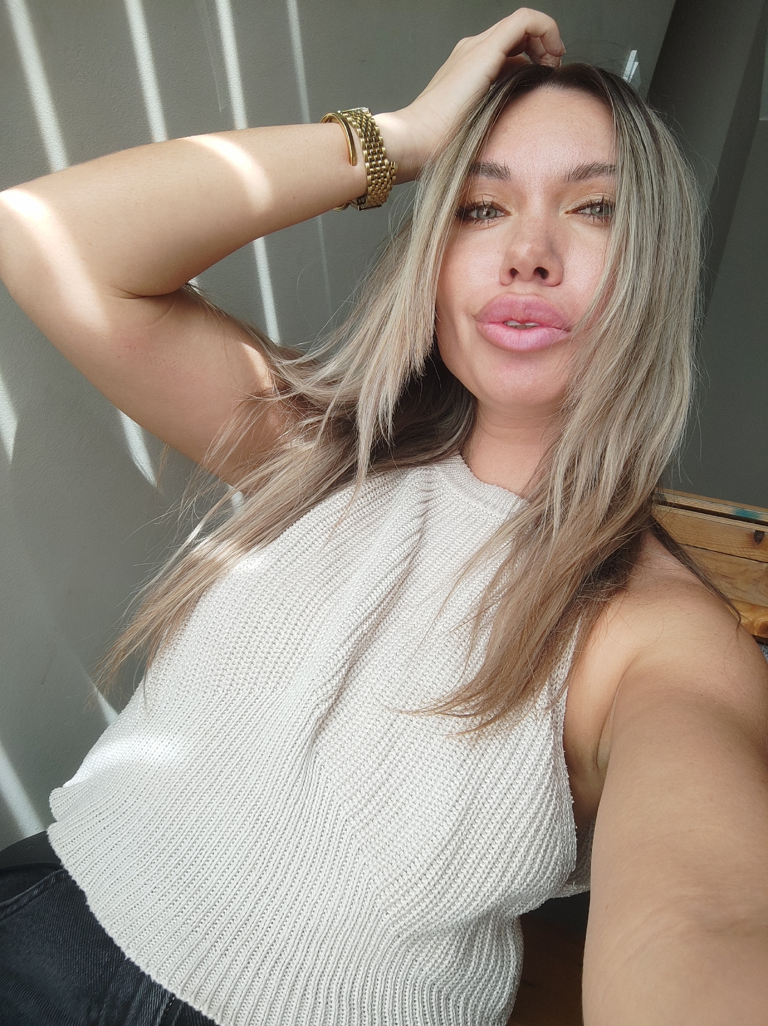 A fair-skinned woman is posing for a selfie indoors. She is seated with her left arm raised, her hand touching her hair, and a gold bracelet is visible on her wrist. She is wearing a white, knitted toβ¦read more