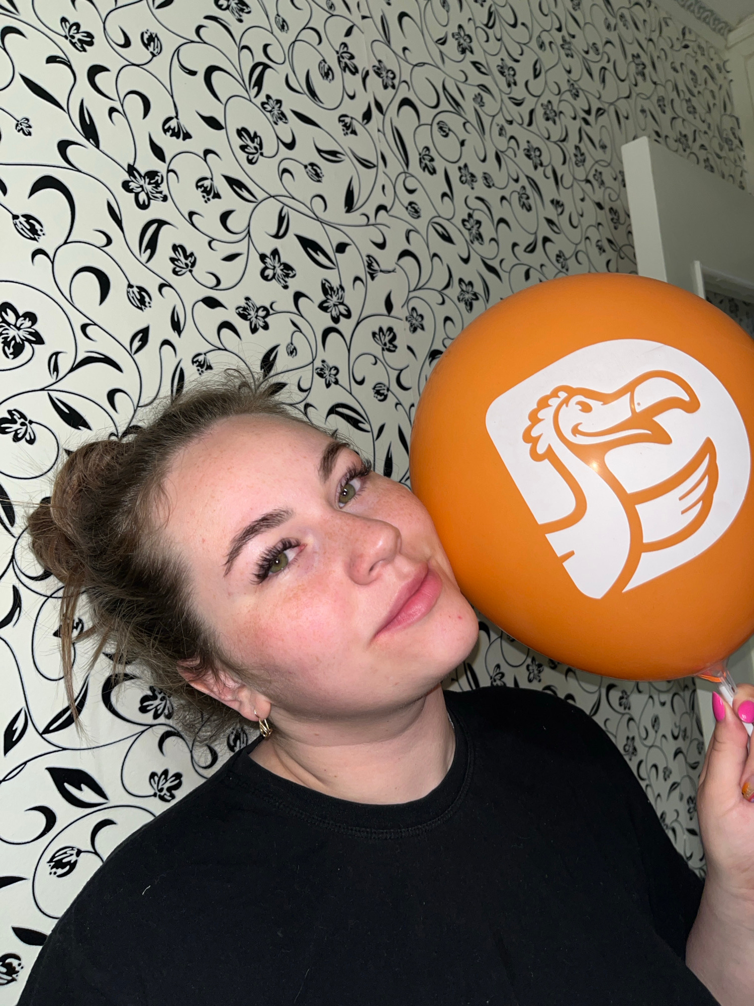 An eye-level shot captures a young woman lying on her back, her head turned to the side, in an indoor setting in Chaikovsky, Russia. She holds a vibrant orange balloon, which rests gently on her foreh…read more